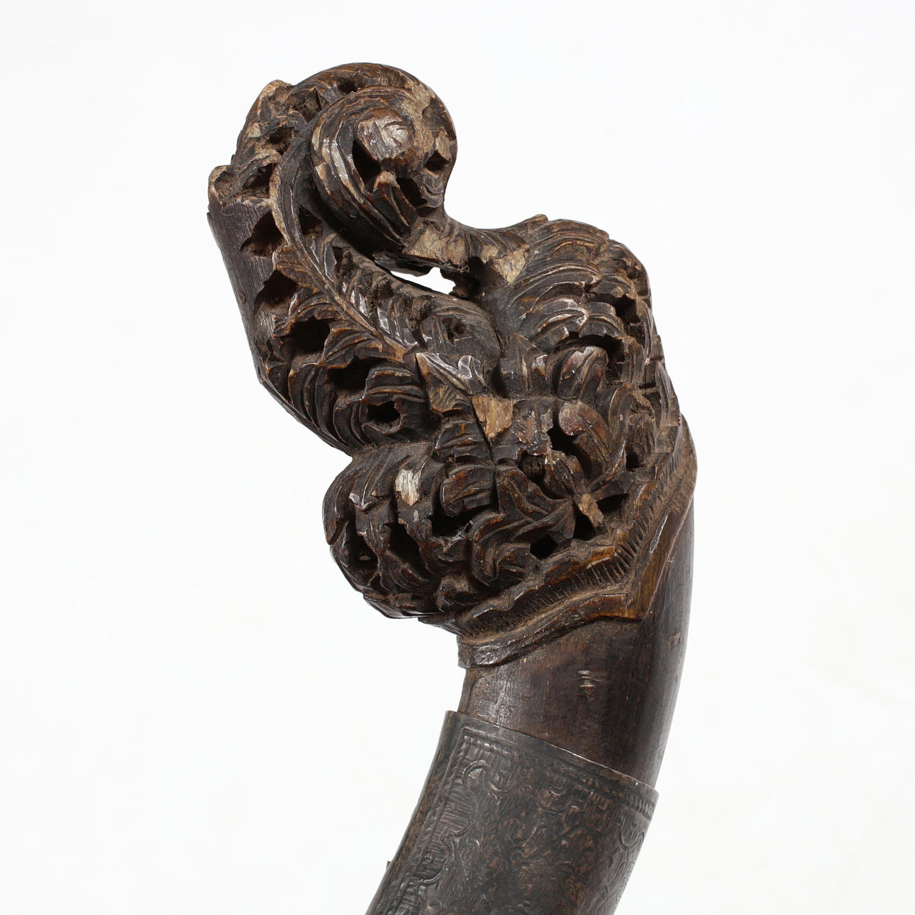 Empuñadura con decoración tallada en madera, detalles en plata.