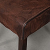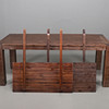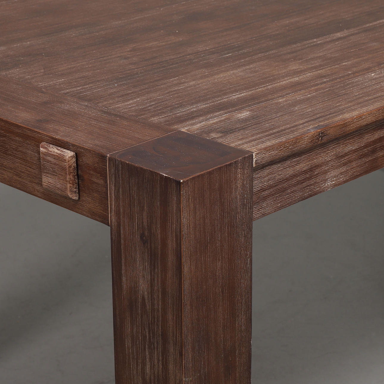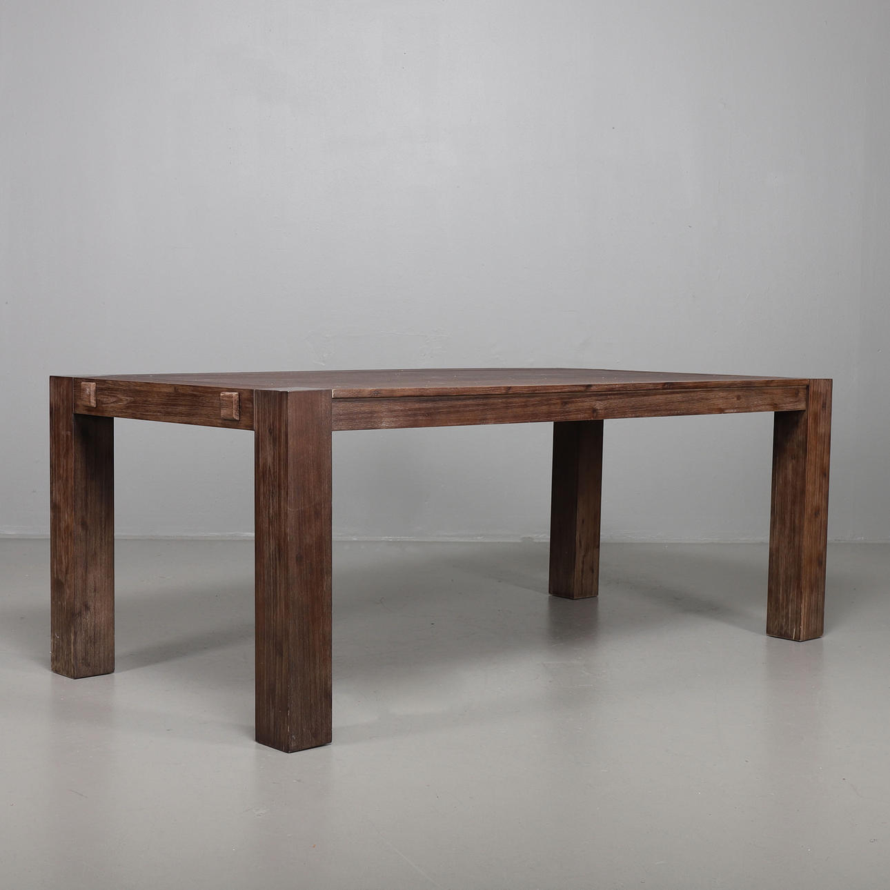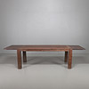 Mesa de comedor en madera teñida oscura con dos extensiones sueltas.