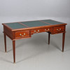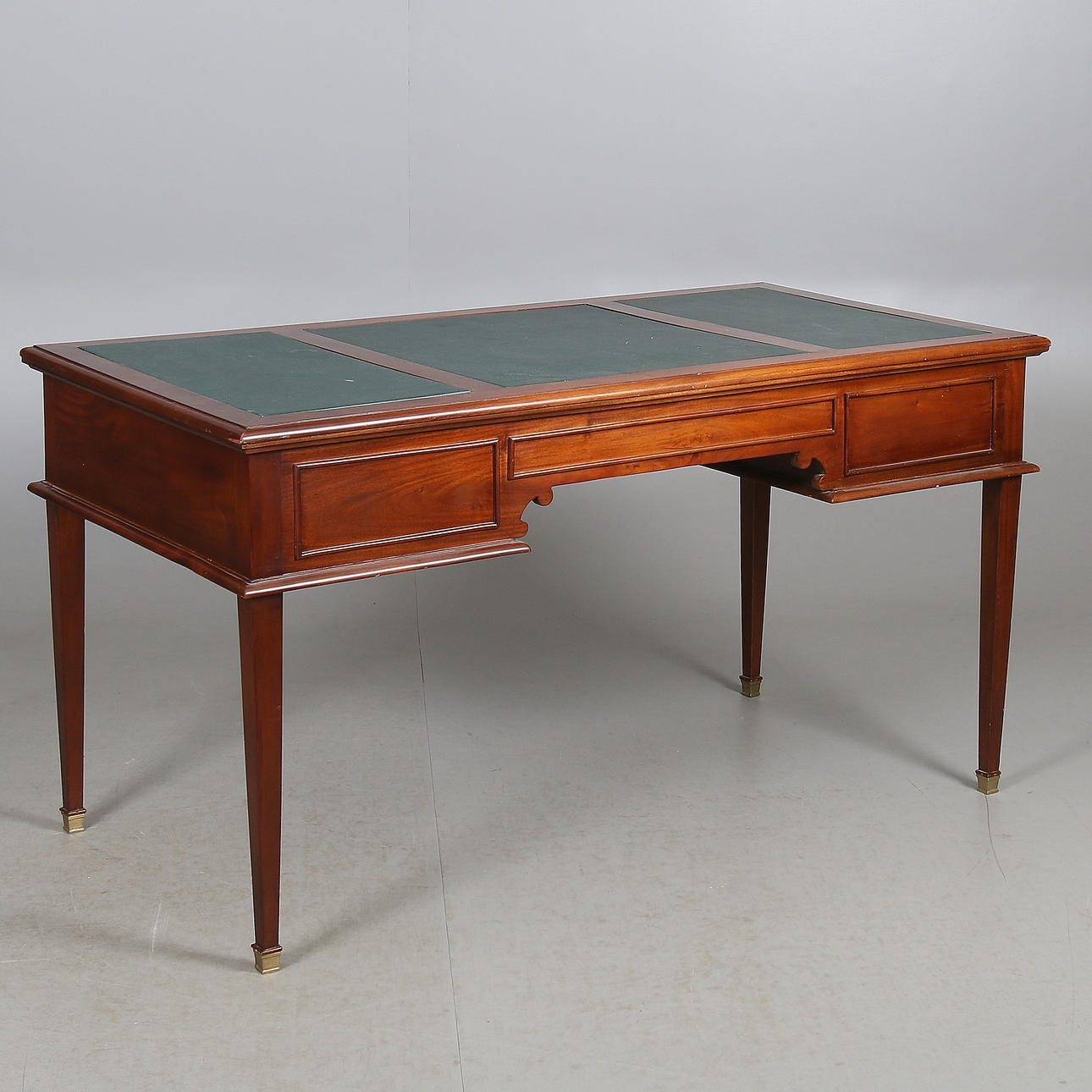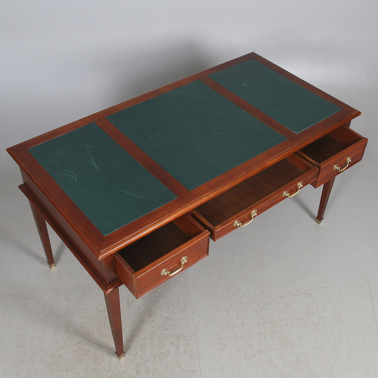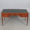 Con tres cajones. Parcialmente cubierto con cuero verde. Largo 142, ancho 74, alto 77 cm.