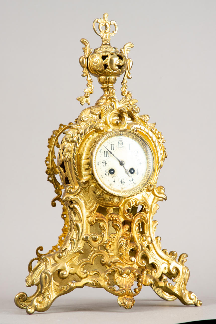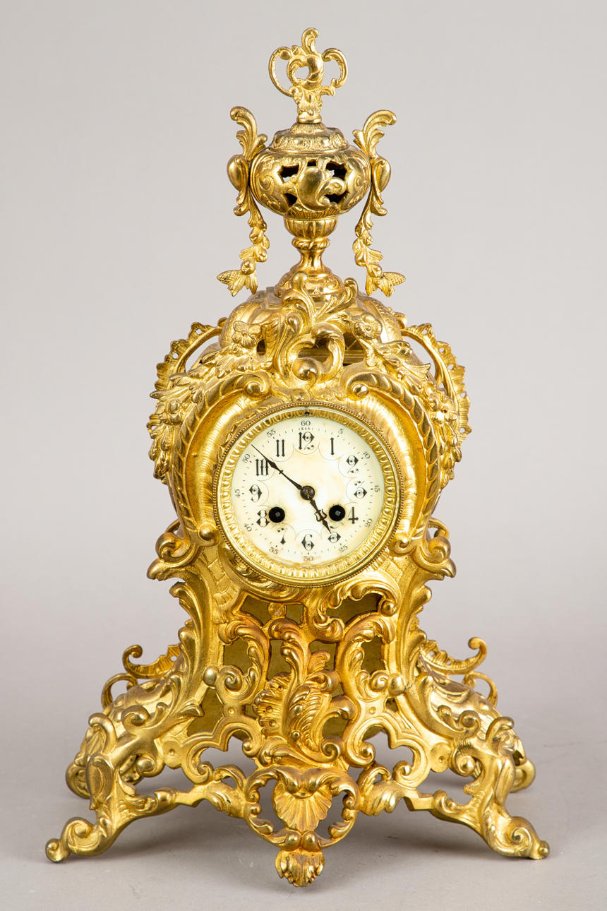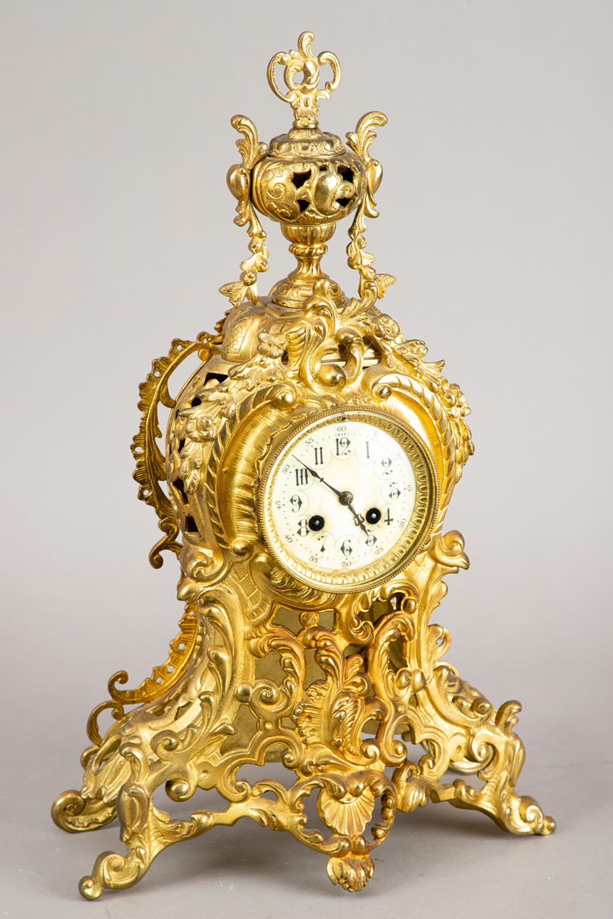 latón fundido. Sobre volutas, el cuerpo entallado calado con volutas de hojas de acanto y oscilaciones en C con una caja de reloj redonda en un marco vegetal y una corona de jarrón. Esfera de marfil (muy dorada) con índices arábigos. Movimiento mecánico de péndulo con enrollador de llave. Al x An x Pr: aprox. 53x34x17cm.