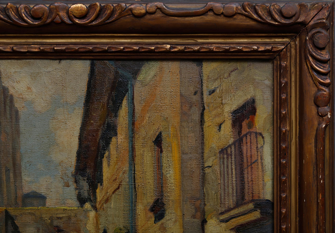 Suciedad superficial y barniz envejecido. Marco en madera dorada.