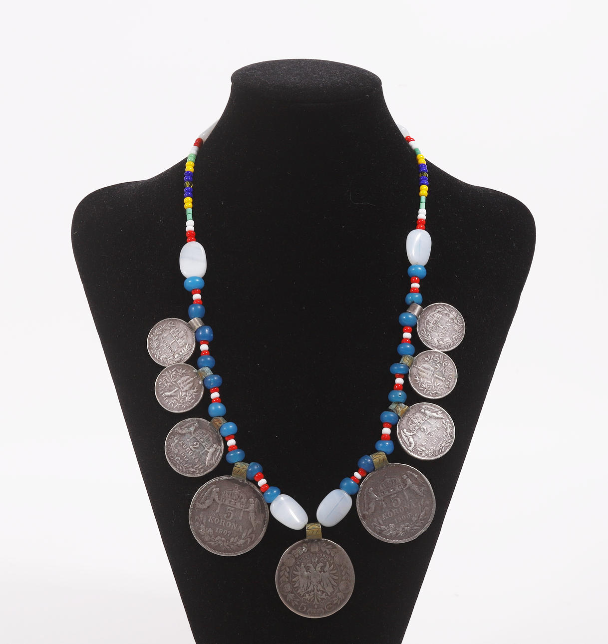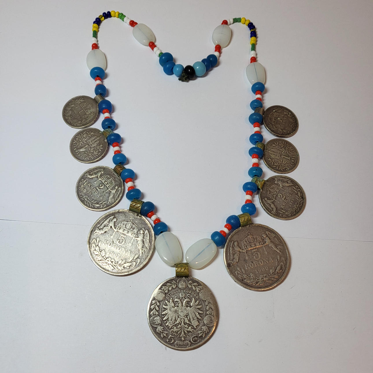 Collar en piedras y cuentas, con monedas de Ferencz Jozsef en disminución de Koronas 1900,1907, 1912, 1914.
