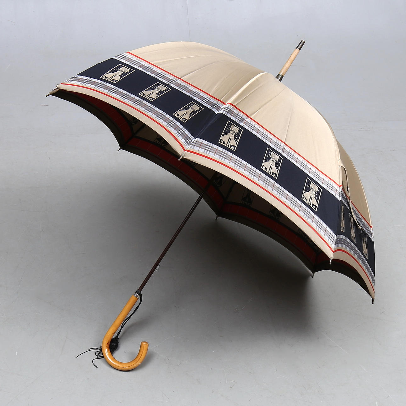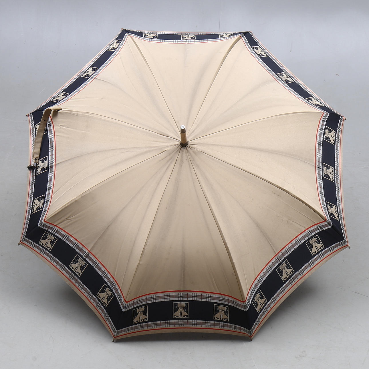 Etiquetado, "Burberrys, Reco, hecho en Inglaterra", 100% poliamida y "Paragon Fox Frames". Altura de unos 84, diámetro de unos 86 cm.