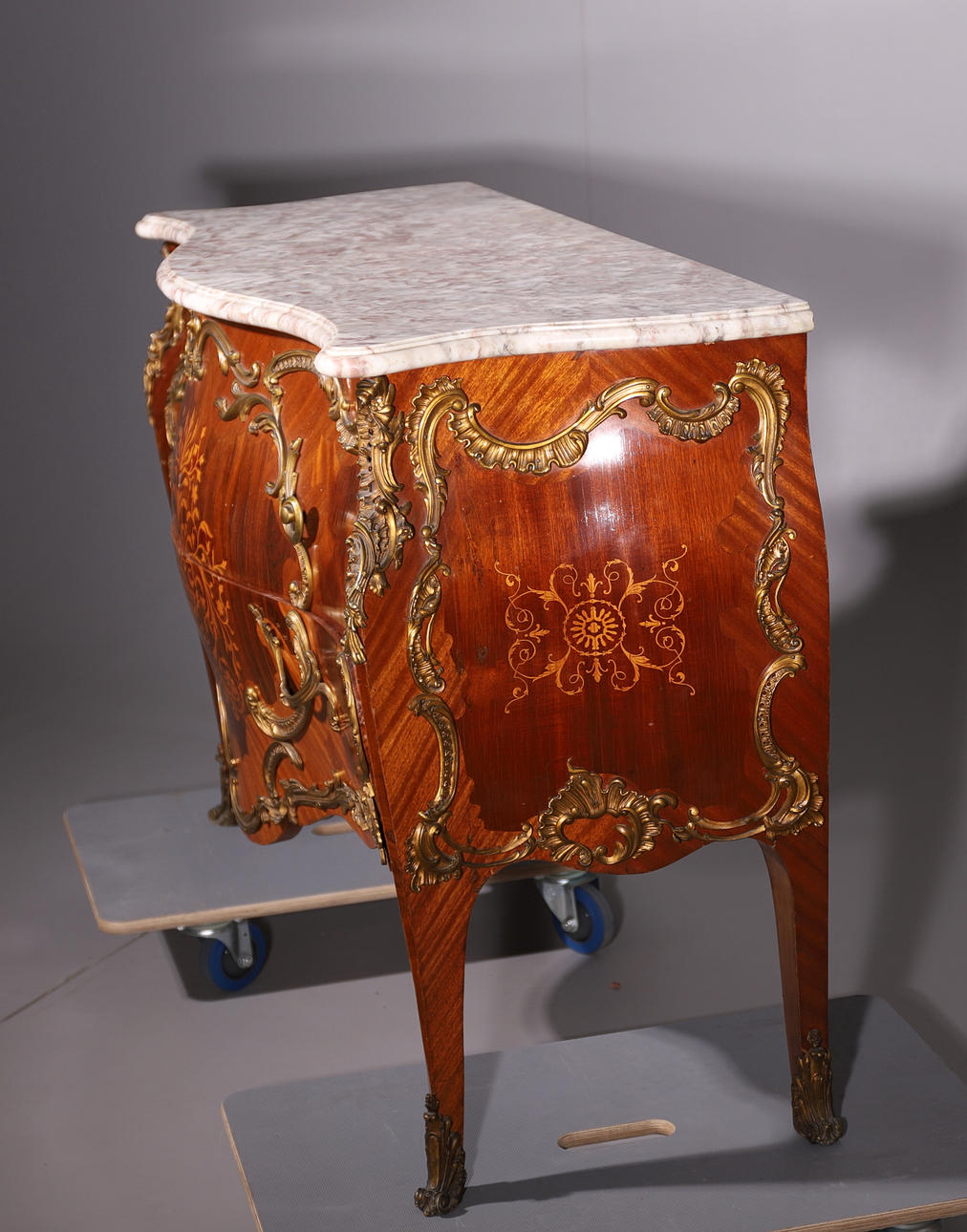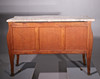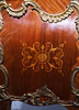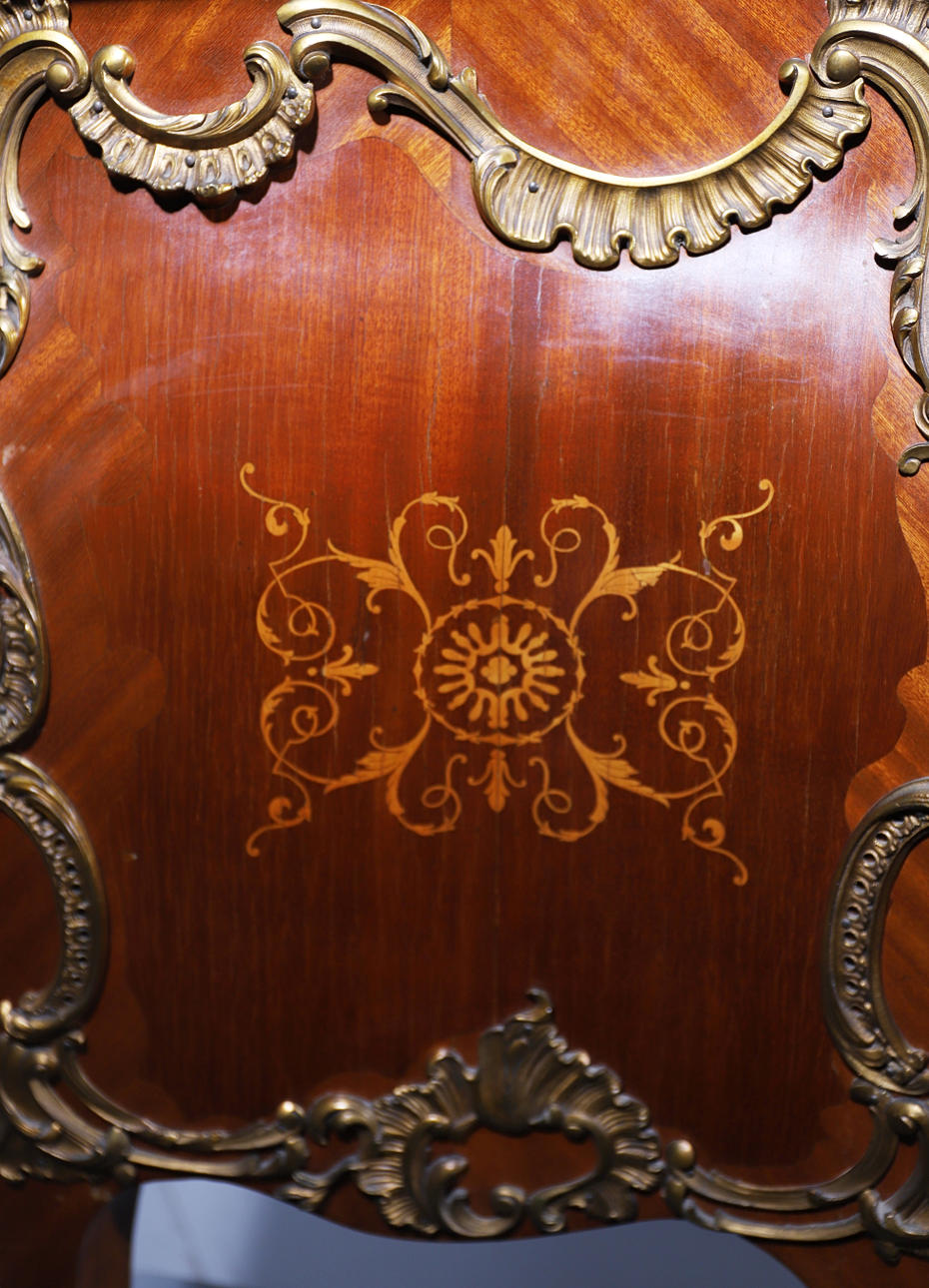 Con sobre de mármol y aplicaciones de bronce dorado. Marquetería de madera con motivo de flores.