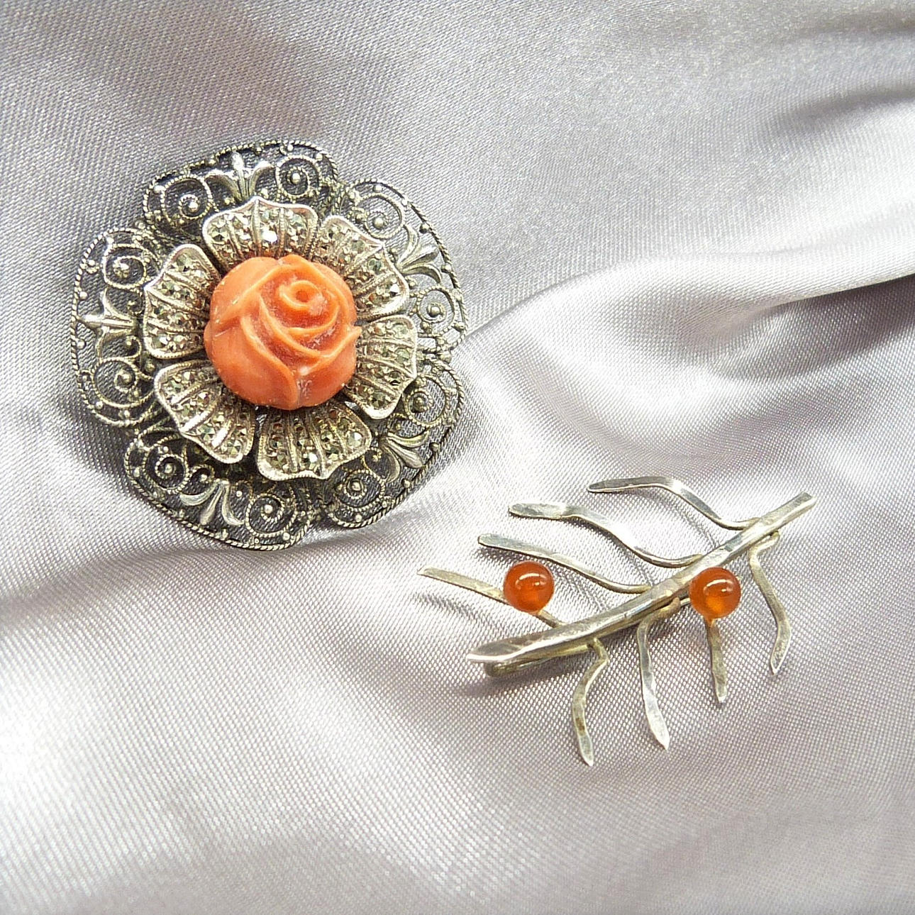 Broche nº1: plata; coral natural tallado a mano en una flor de rosa; piedras de marcasita; patrón de filigrana adornado; pasador con bisagras; 31 mm de diámetro; 10,1g Broche nº2: plata; diseño de tallos y ramas; dos cuentas redondas de ámbar; barra de pines; 35x24 mm; 1,6 g Ambos broches son antiguos y probados como plata.