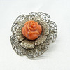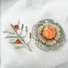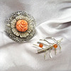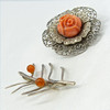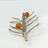 Un dúo de broches de plata, uno con rosa coral y el otro engastado con cuentas de ámbar.