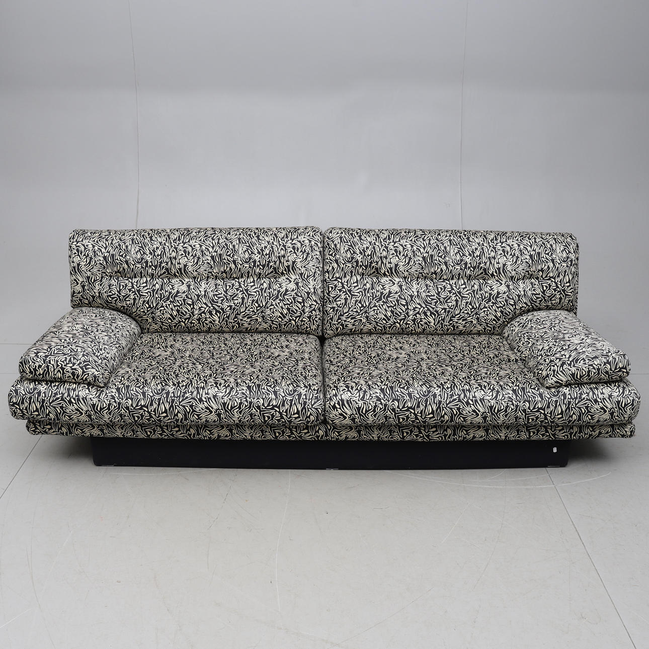 Cojines sueltos en el respaldo y asiento. Ropa estampada con figuras. Longitud unos 220 cm.