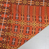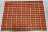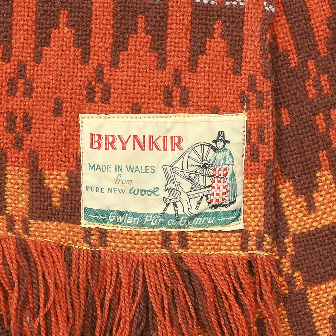 con fondo marrón con patrones geométricos repetidos en naranja, amarillo y blanco con flecos en cada extremo, con la etiqueta 'Brynkir Made in Wales, from Pure New Wool' 246 cm de ancho x 176 cm de largo Propiedad de una herencia fallecida, vendida por orden de albaceas.