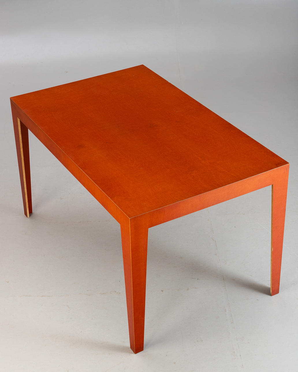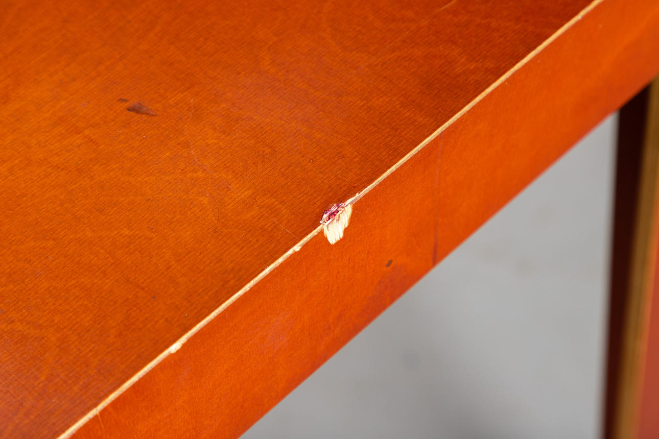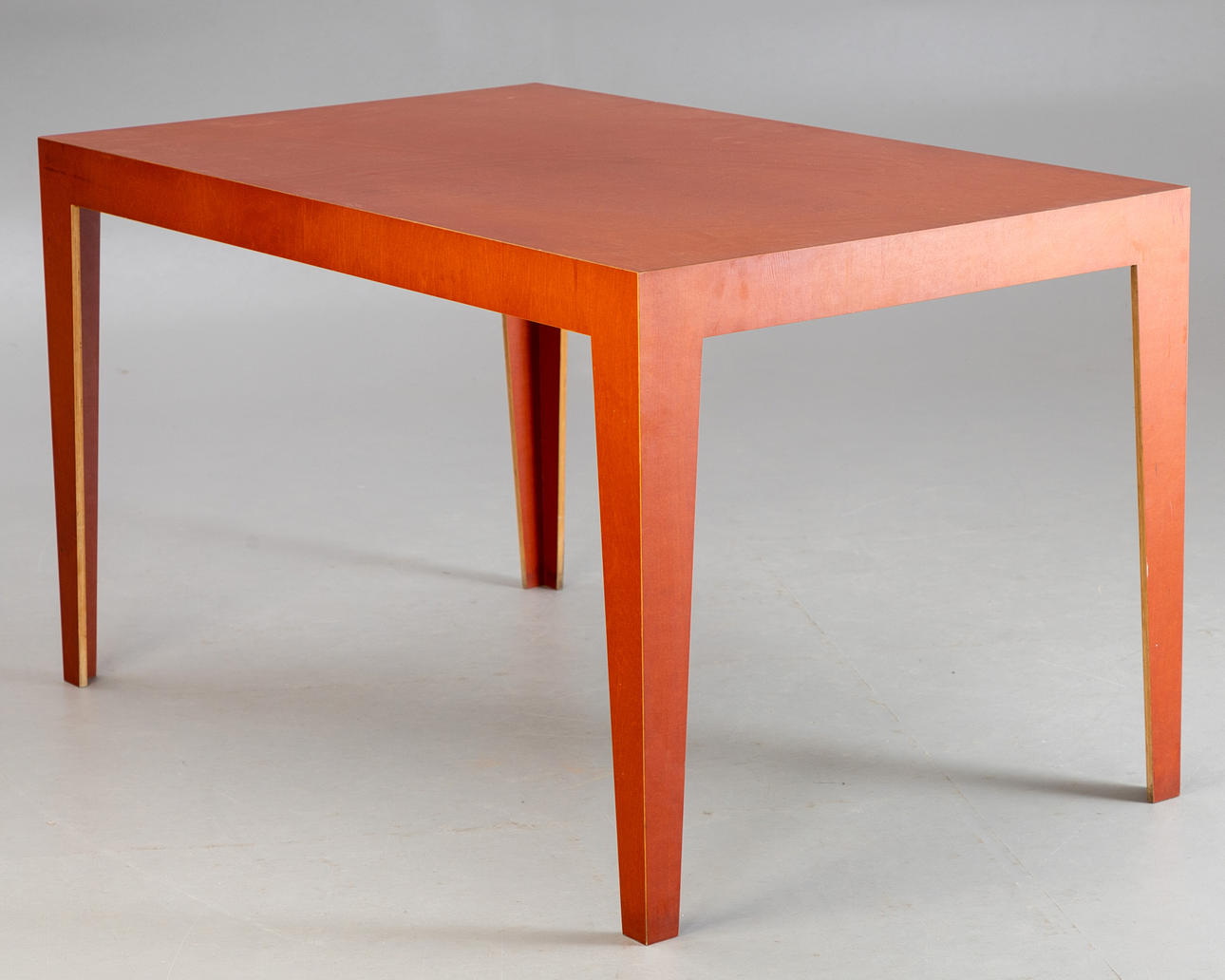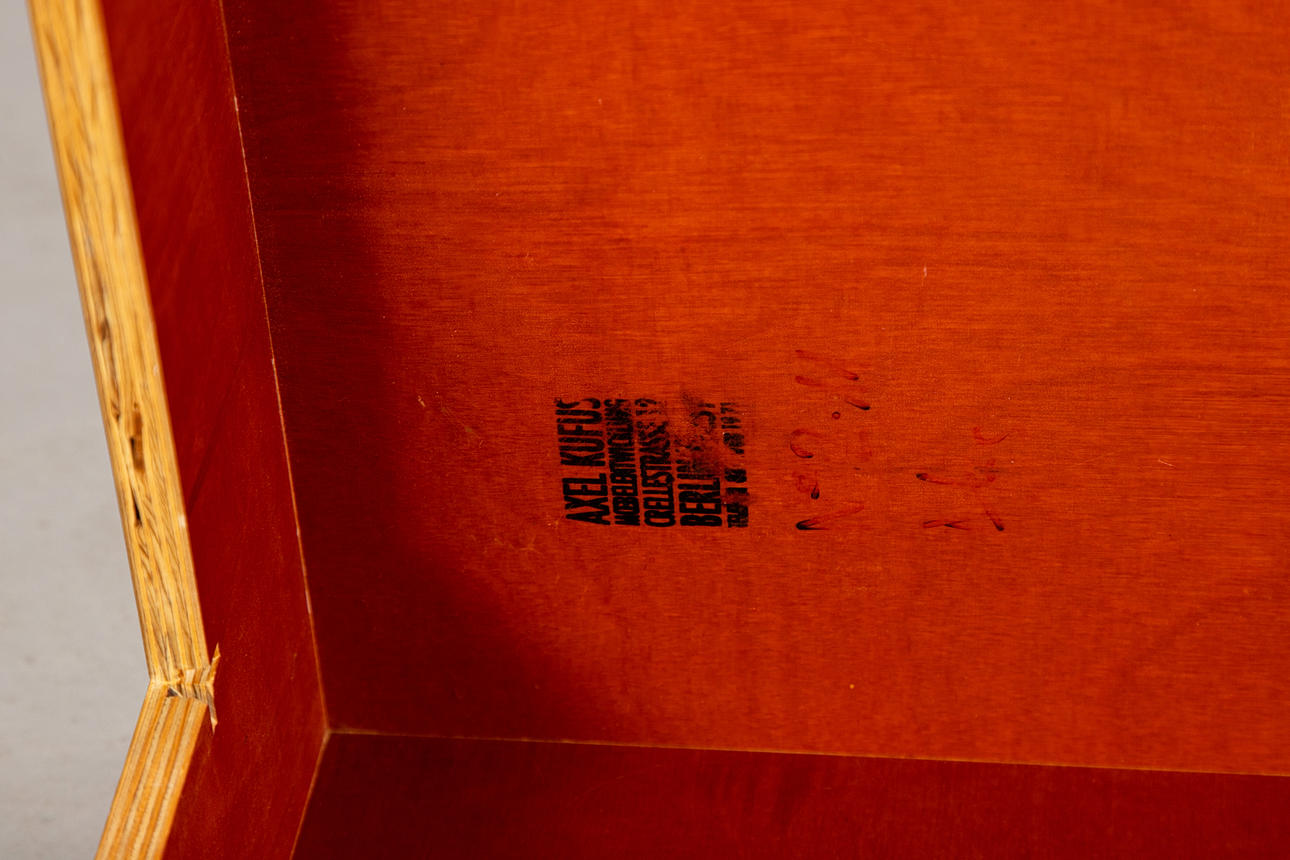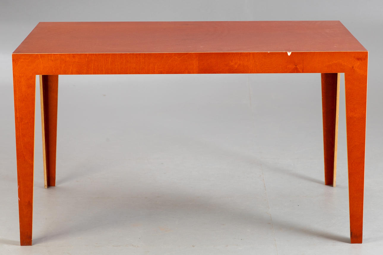 Mesa de Axel Kufus. Borrador: 1987. Modelo de pequeña serie realizado en todo el mismo material, madera multiplex de abedul en color marrón rojizo, a inglete. Estampado debajo.