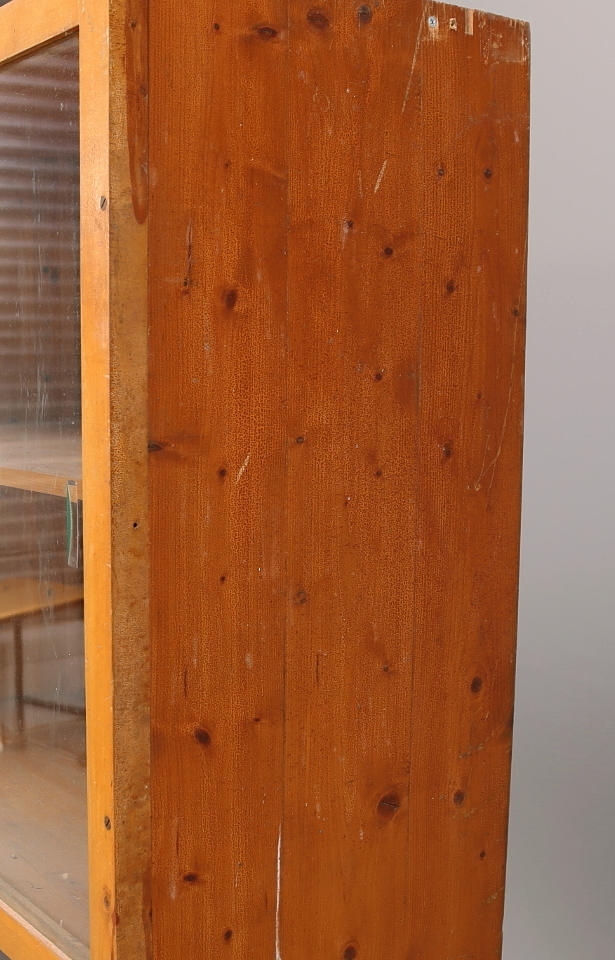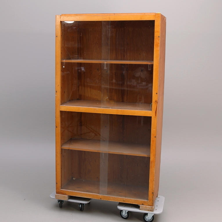 Probablemente de una tienda rural. Estantería con puertas correderas de cristal en dos cuerpos. Alto 168, largo 90, ancho 42 cm.