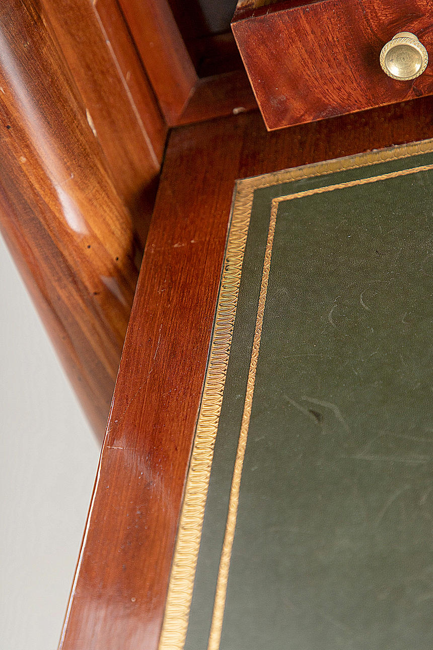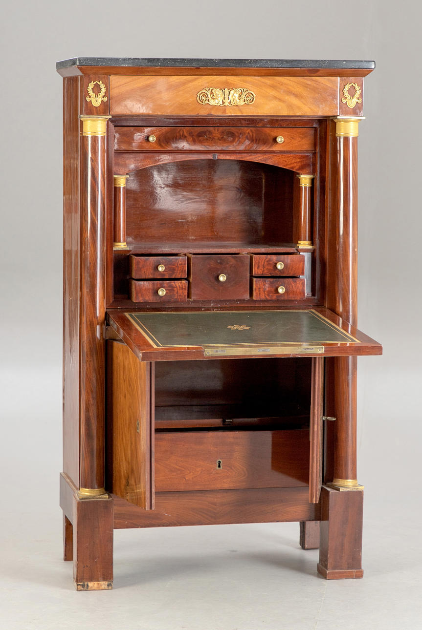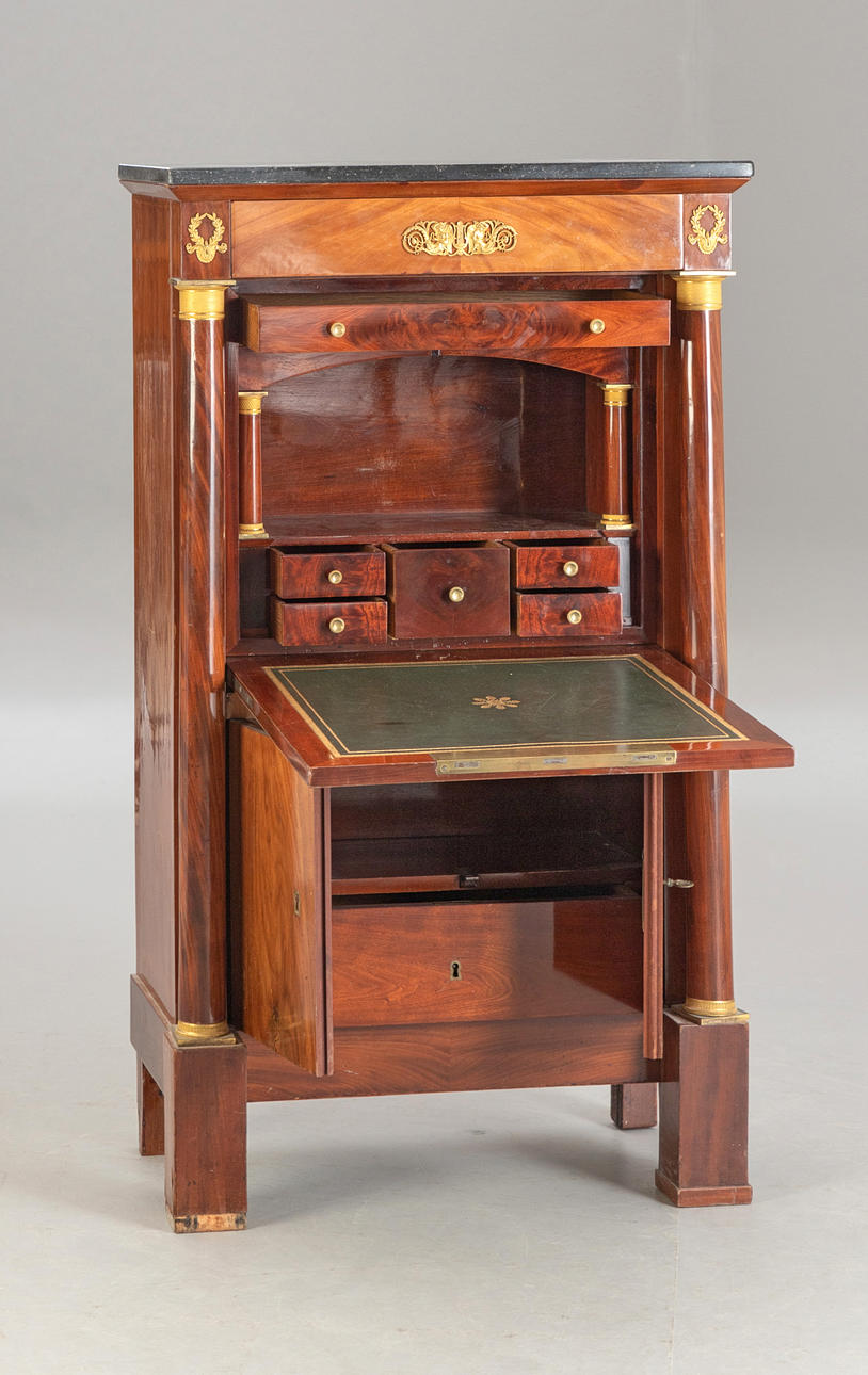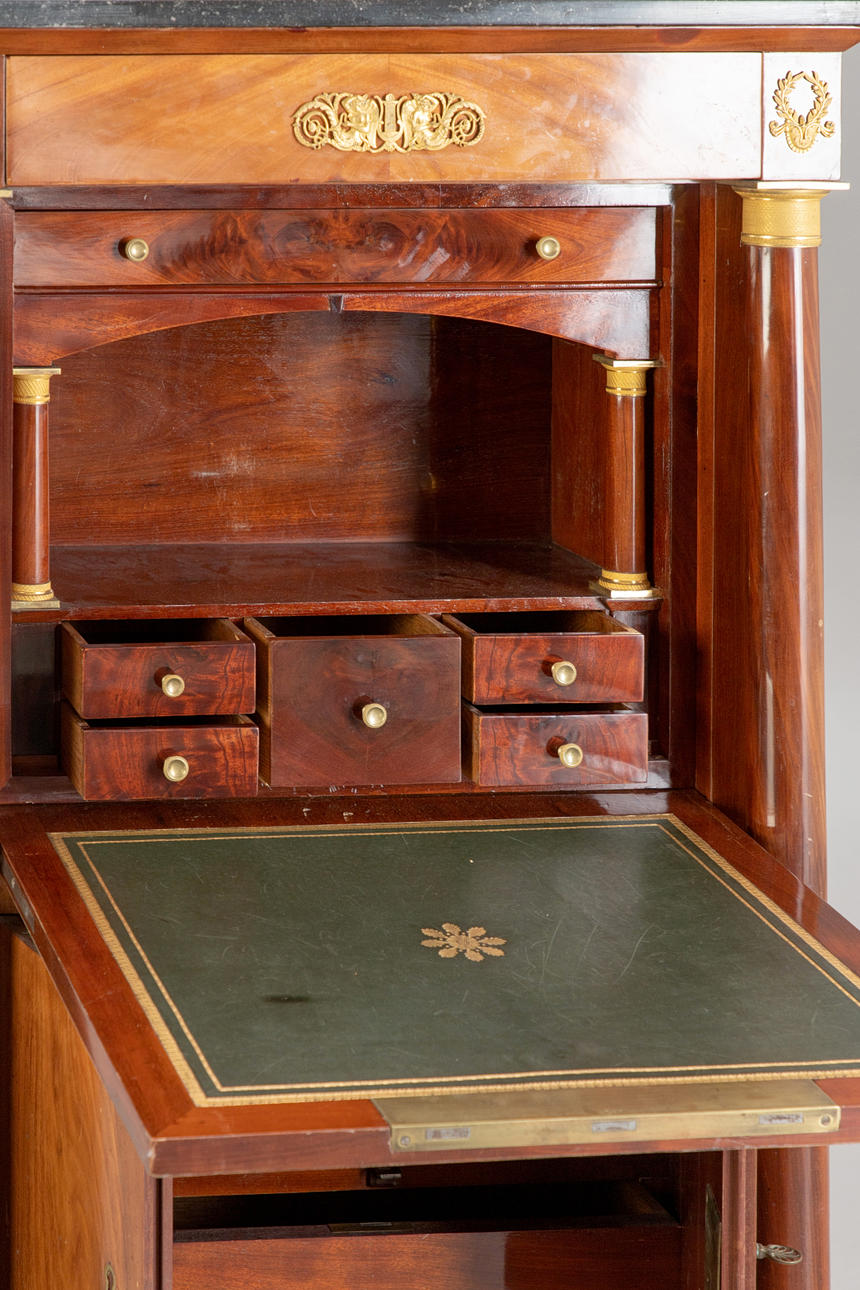 Caoba/latón/cuero verde. Cuerpo delgado y alto rectangular, dividido por un pequeño medio gabinete debajo de la superficie de escritura plegable y el último cajón sobresaliente. Placa superior de granito. Las columnas redondas superiores en basas y capiteles torneados a máquina. Aplicaciones bañadas en oro a juego. Interior articulado. alto x ancho x profundidad: aprox. 137x78x41cm.