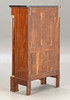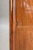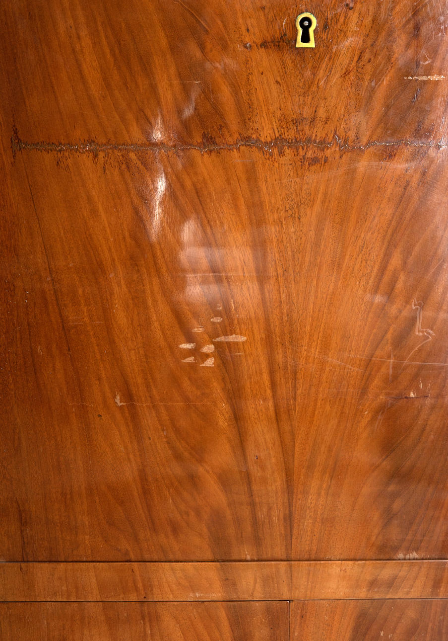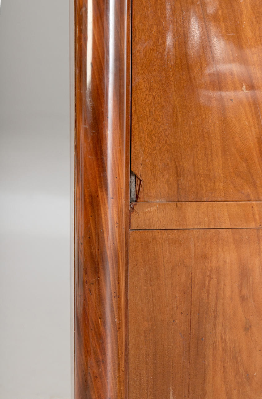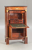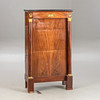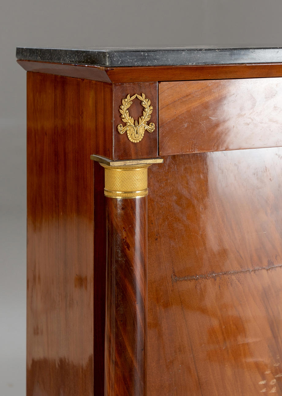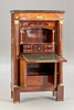 Caoba/latón/cuero verde. Cuerpo delgado y alto rectangular, dividido por un pequeño medio gabinete debajo de la superficie de escritura plegable y el último cajón sobresaliente. Placa superior de granito. Las columnas redondas superiores en basas y capiteles torneados a máquina. Aplicaciones bañadas en oro a juego. Interior articulado. alto x ancho x profundidad: aprox. 137x78x41cm.