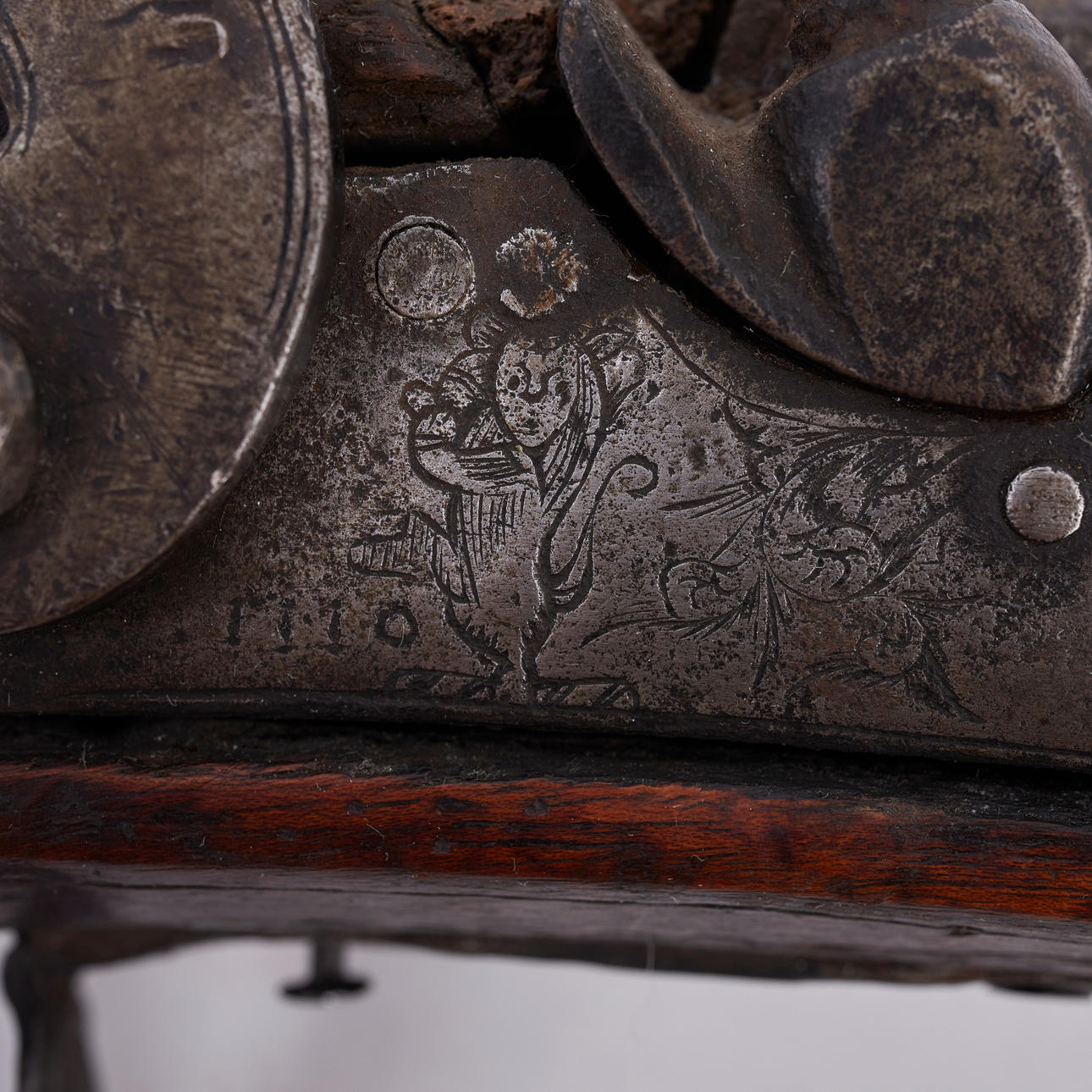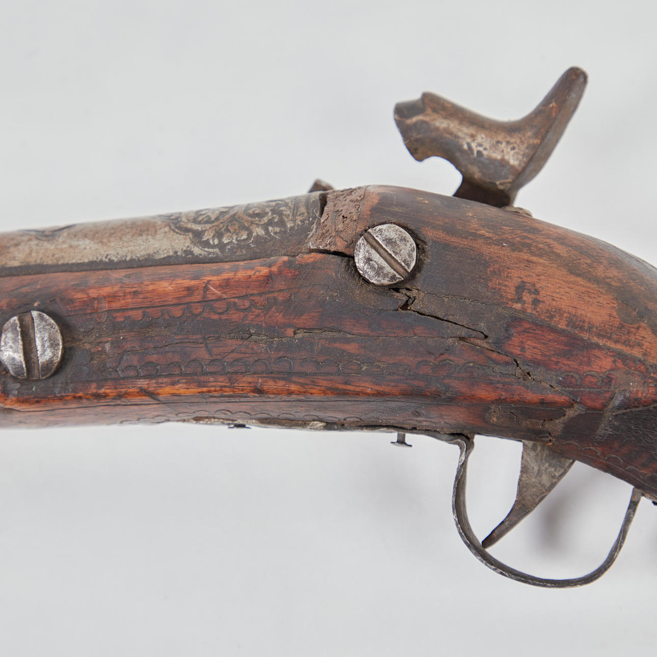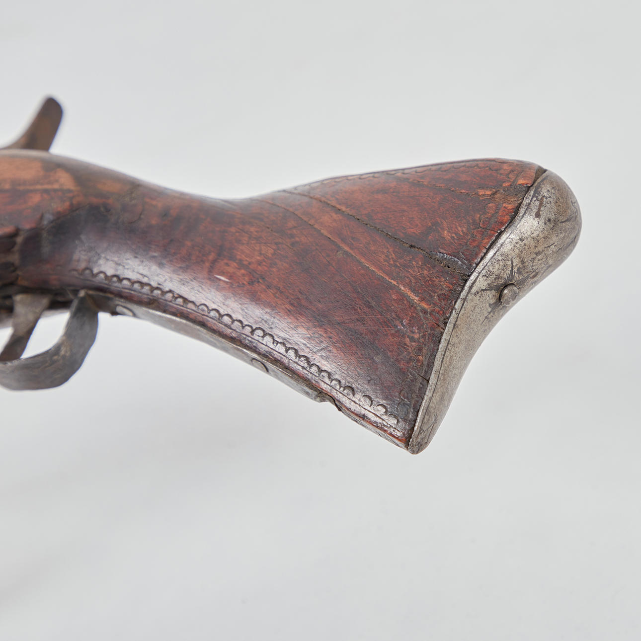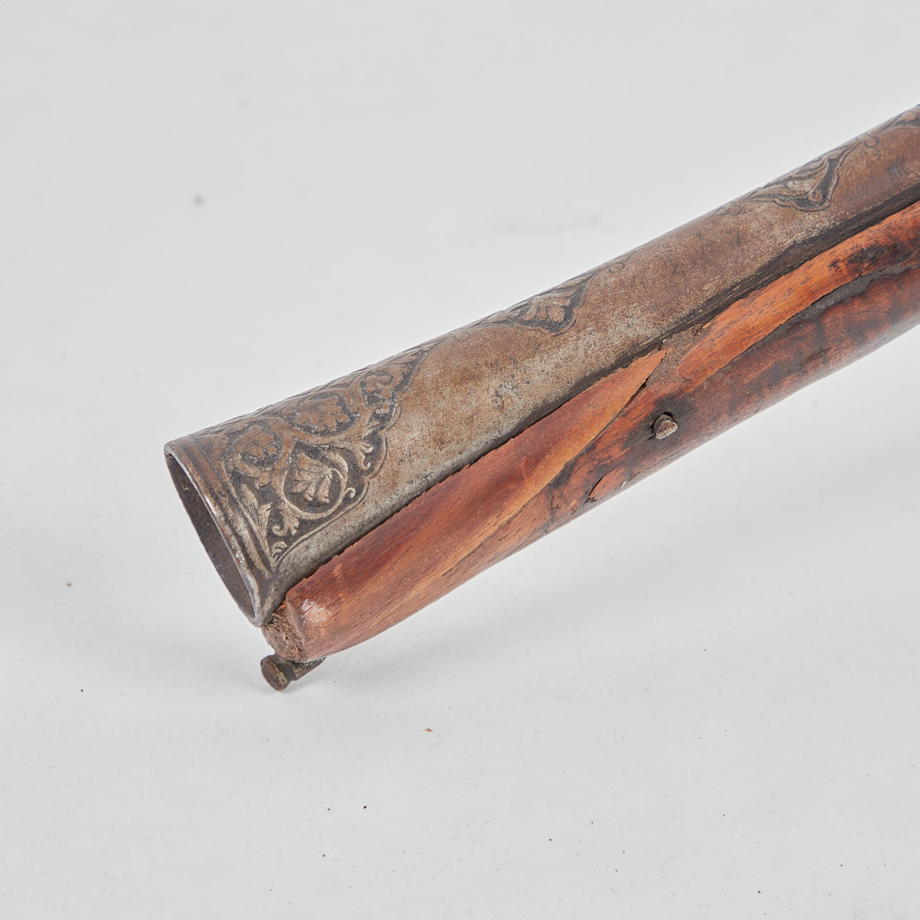 Tromblón / escopeta, siglo XIX. Tromblón con mecanismo de percusión, cañón redondo con boca ligeramente ensanchada y grabado floral-ornamental, herrajes y baqueta, no apto para tiro, L.51cm, longitud del cañón: 30,5cm.