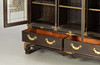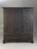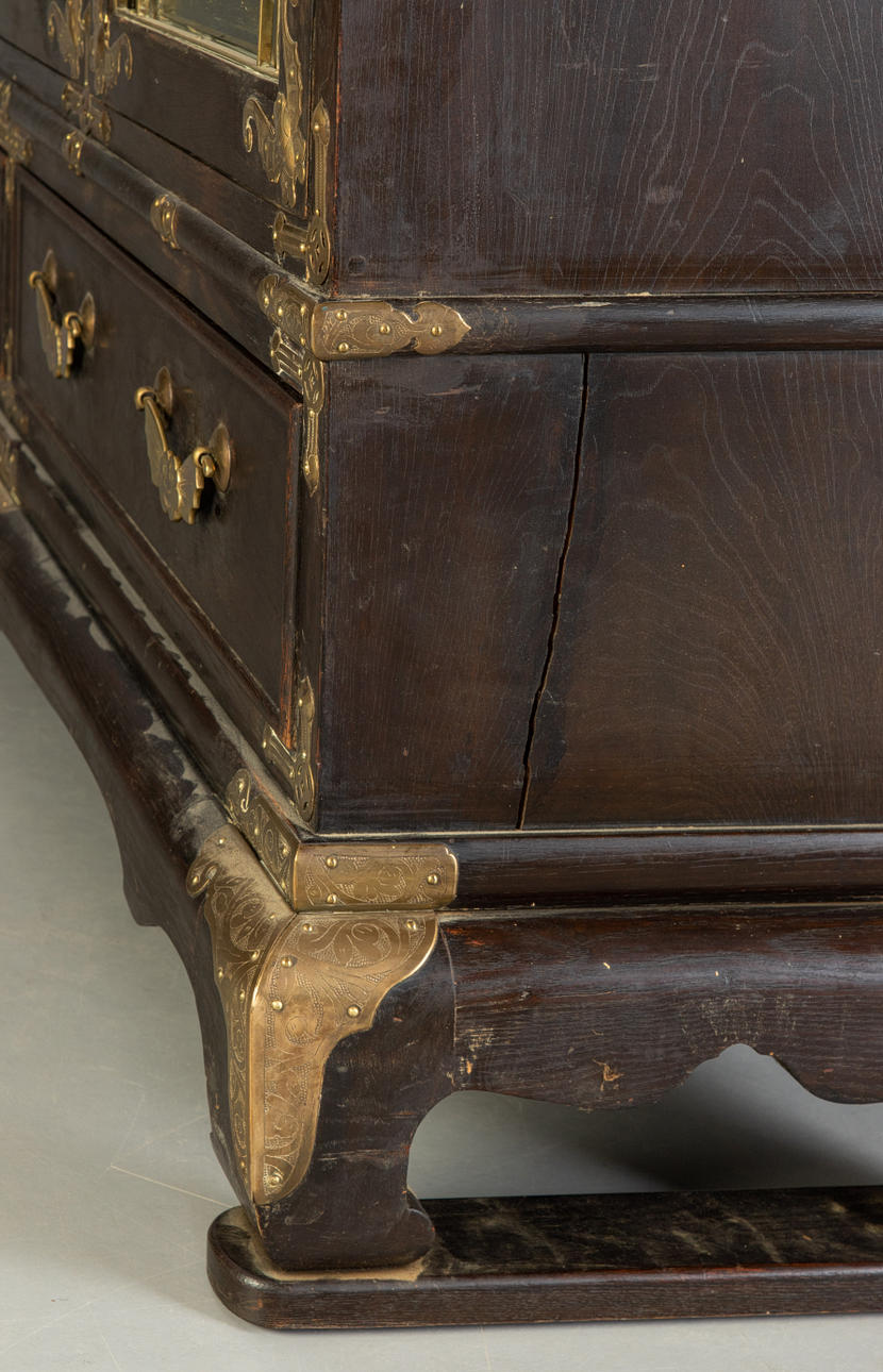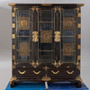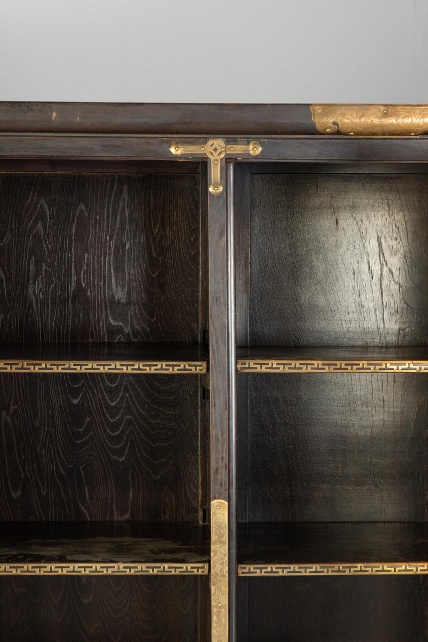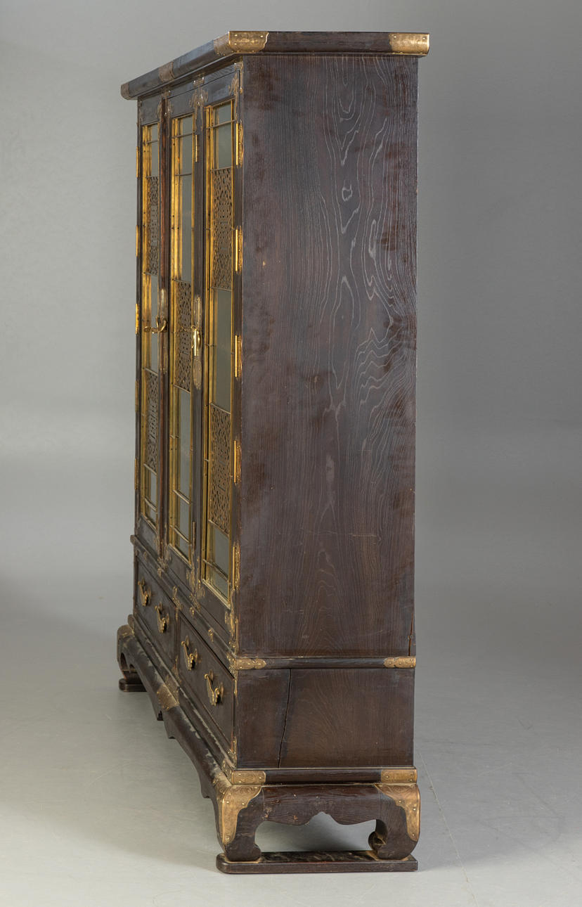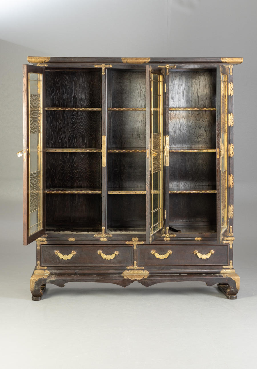Cuerpo recto sobre una base saliente con patas curvas bajo un marco curvo. Pies conectados por dos tiras. Estructurado por puertas tripartitas con vidrio y aplicaciones circundantes de latón en forma de murciélagos, mariposas y el cartel calado de la doble felicidad con motivos de zarcillos. En el interior tres estantes con aplicaciones de latón. Dos cajones. Dos llaves disponibles. Al x An x Pr: aprox. 167x148x41 cm PROCEDENCIA: Colección privada de un empleado de envíos de Norddeutscher Lloyd, que estuvo empleado en negocios de Asia Oriental en Shanghái y Yokohama hasta 1940.