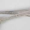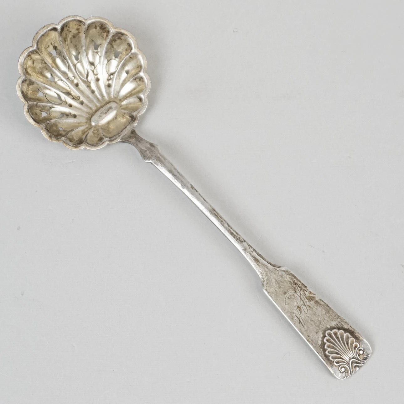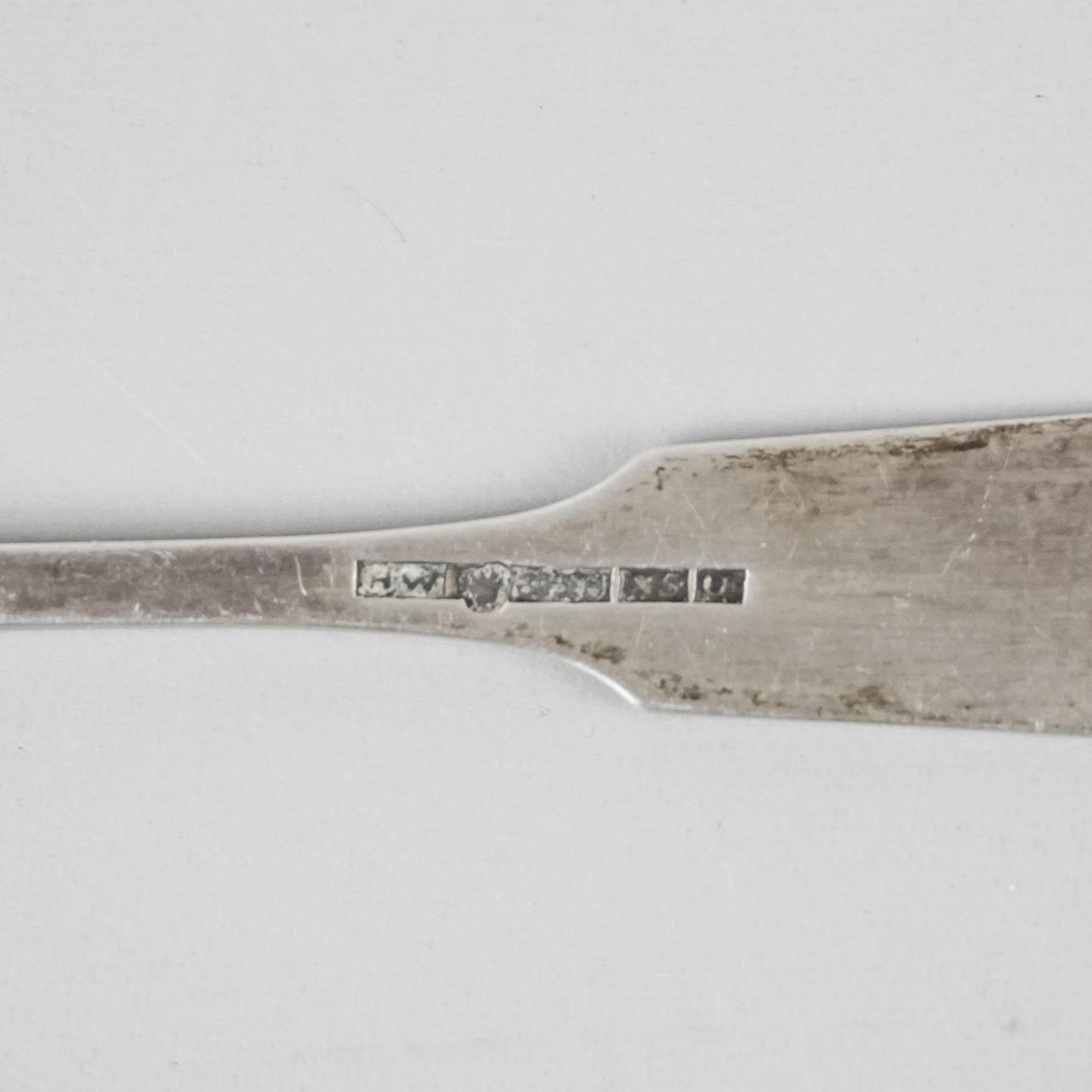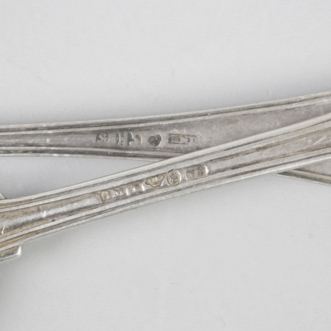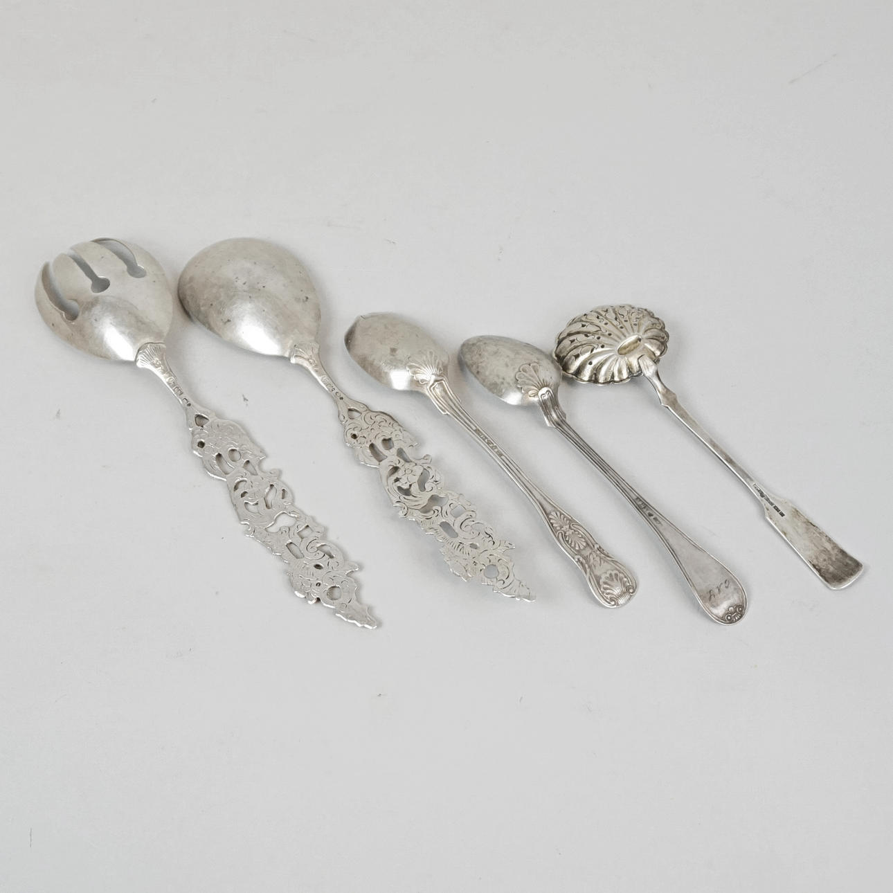 1 par de cubiertos para ensalada, mango con decoración calada, plata 830. Longitud 19,5 cm 1 aspersor de azúcar, Herman Wist, Uusikirkko, Finlandia, 1927, longitud 14 cm 1 cucharadita Gustaf Möllenborg Feron, 1851, longitud 14,5 cm 1 cucharadita, estampado END, Södertälje, 1862, longitud aproximada 14 cm.