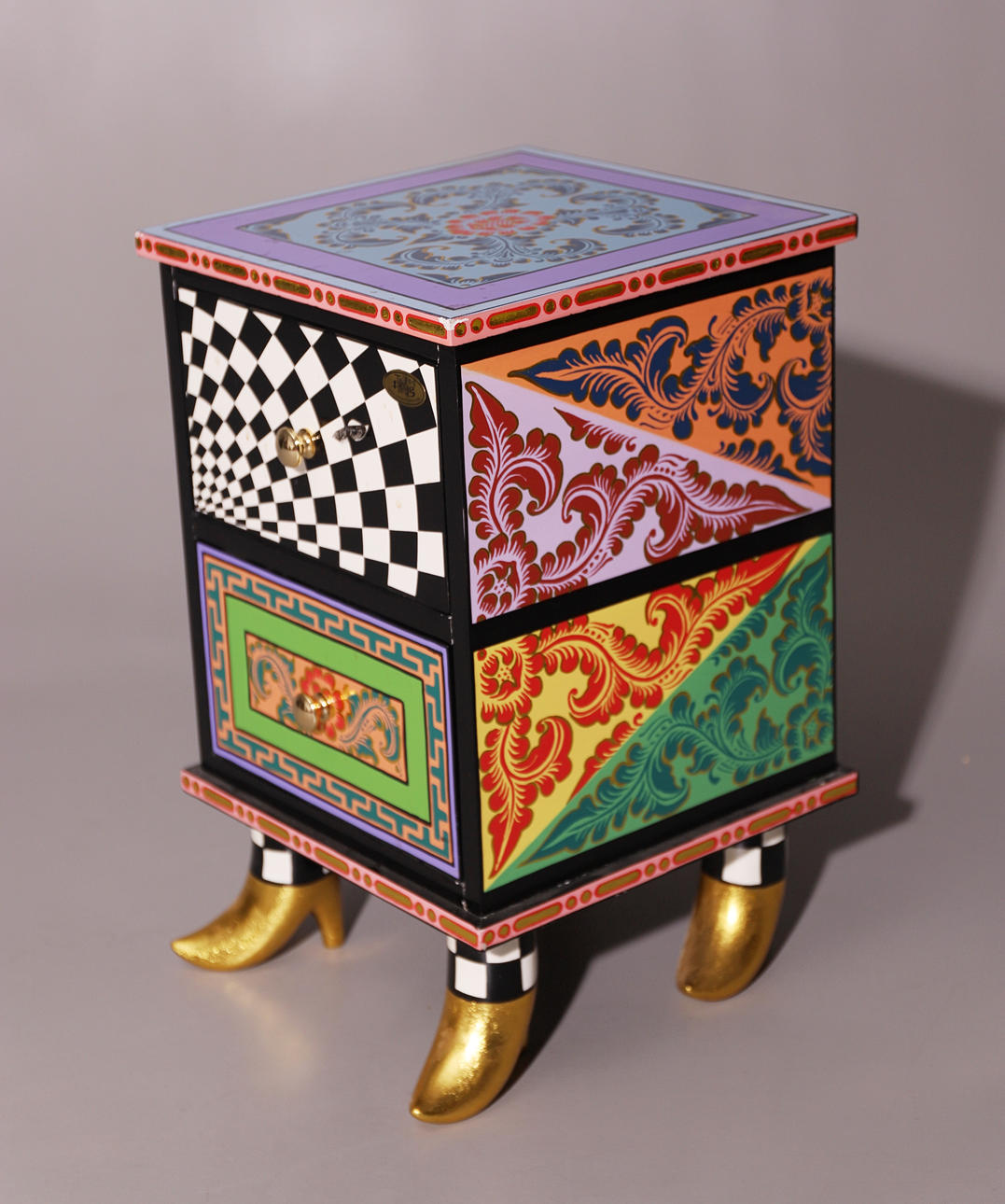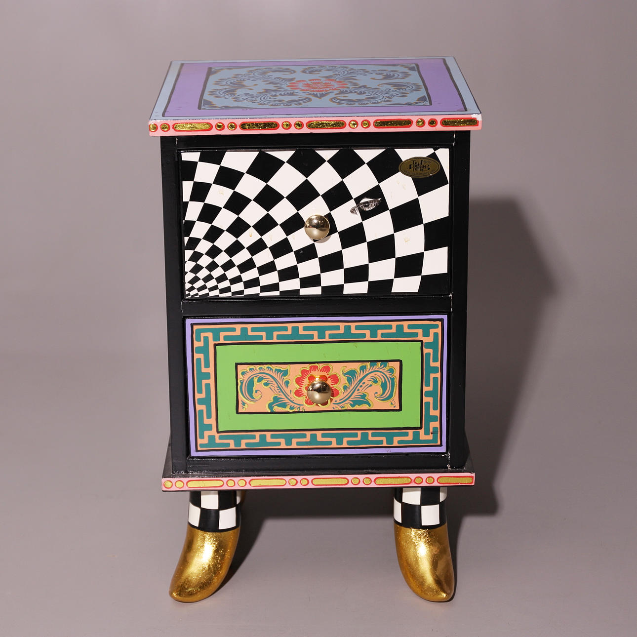 Con diseños geométricos de Tom's Drag. Patas a modo de zapatos dorados.