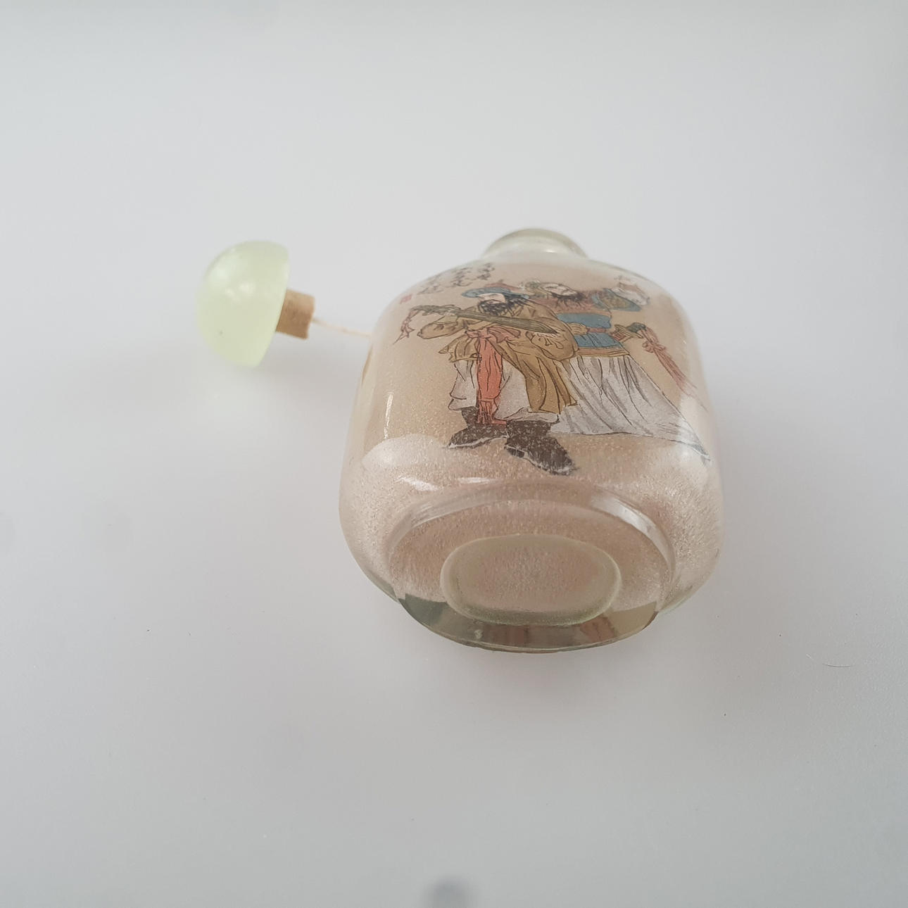 Vidrio por ambas caras con representaciones figurativas en fina pintura mural interior, inscrito, tapón con cucharita, H. aprox. 8 cm, aprox. 68,2g.