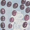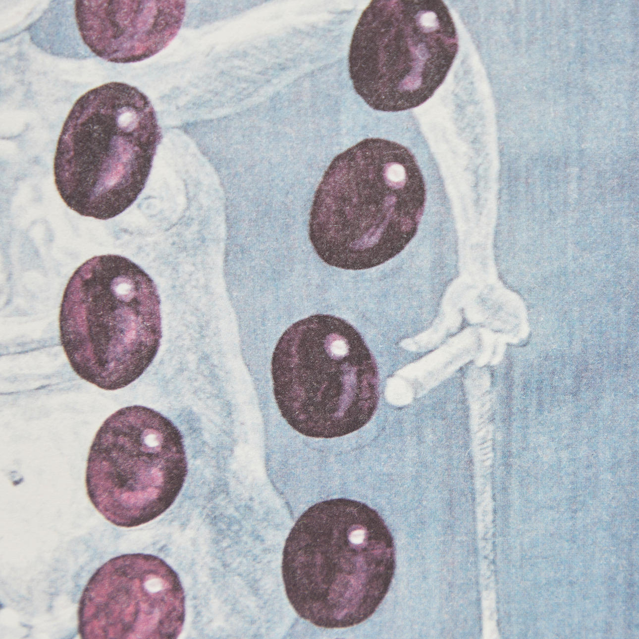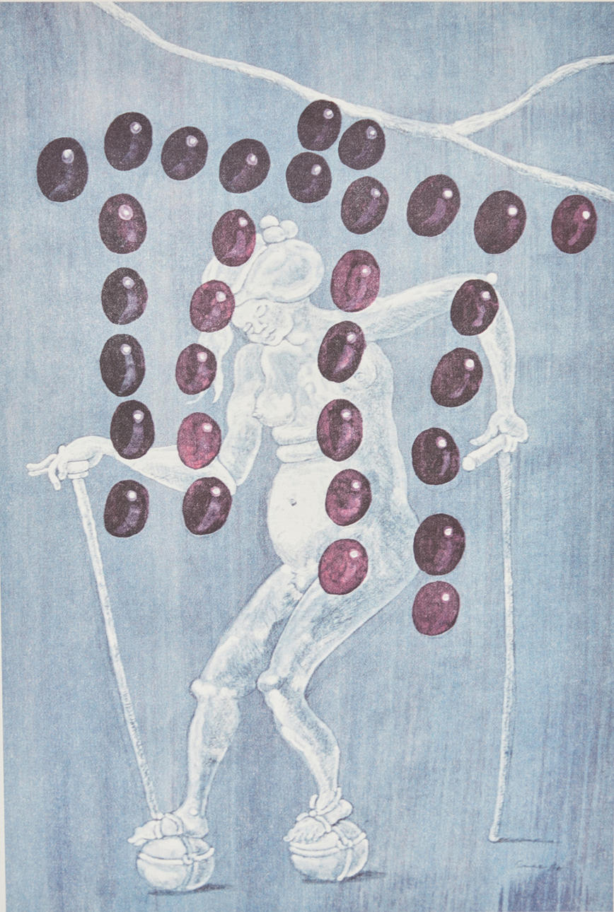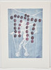 Jörg Immendorff (1945-2007), offset de color, sin título. Composición figurativa en blanco sobre azul que representa uvas en forma de Puerta de Brandenburgo, diseñada en 2001 como etiqueta de vino para la 'Cuvée Berlin', firmada en plomo abajo a la derecha, 43x31cm.