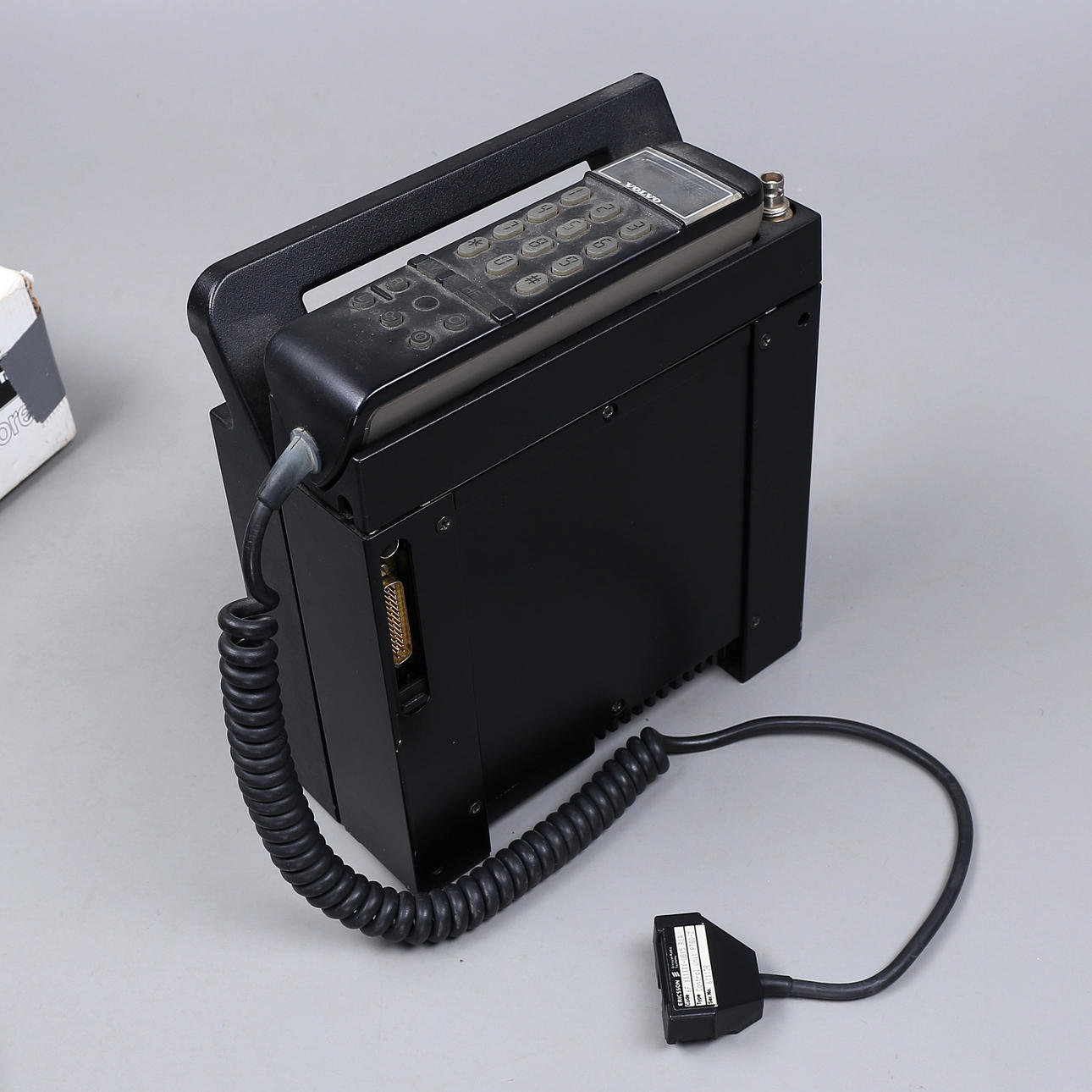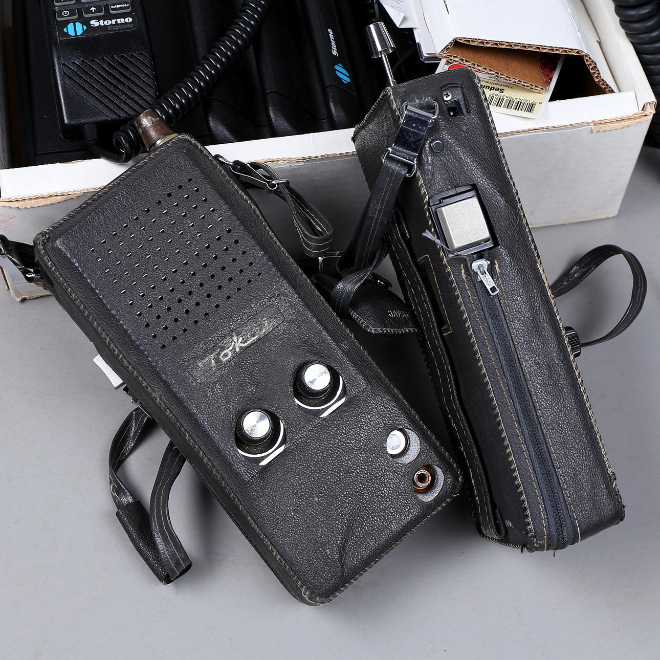 Teléfono móvil, Motorola, Storno Explorer, años 80. Walkie-Talkie, un par, Tokai TC-502S, años 80. Teléfono móvil, Volvo, Ericsson, años 80.