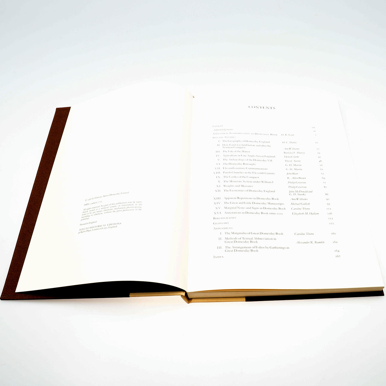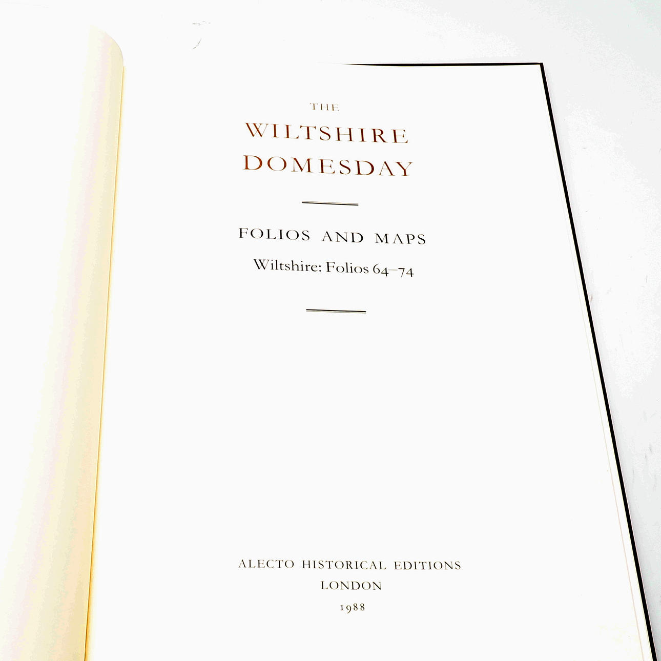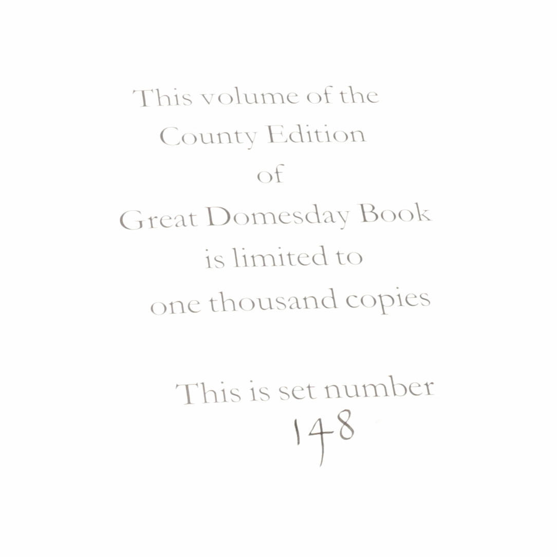 Ediciones históricas de Alecto 1987-1988, tres volúmenes, que comprenden Introducción y traducción; Estudios de libros de Domesday; Folios y mapas, folios y mapas con grandes mapas plegados sueltos de Inglaterra en el momento del Domesday Survey 1086-87 y el condado de Wiltshire según Domesday Book, 1086-1087, tableros con respaldo de lino en estuche a juego.