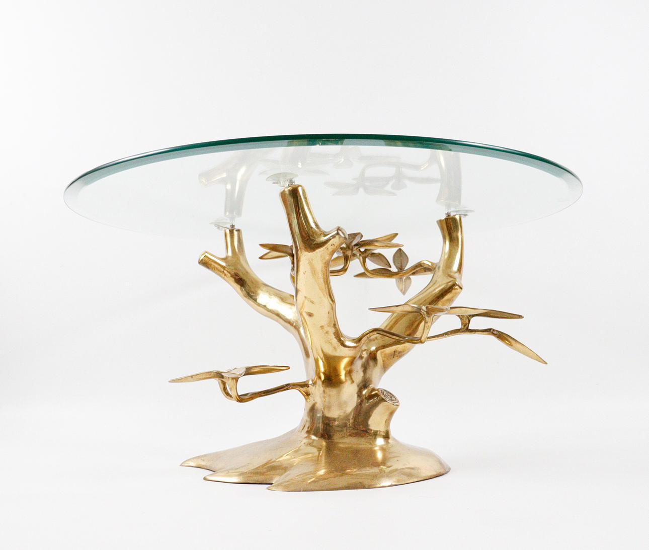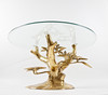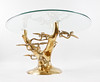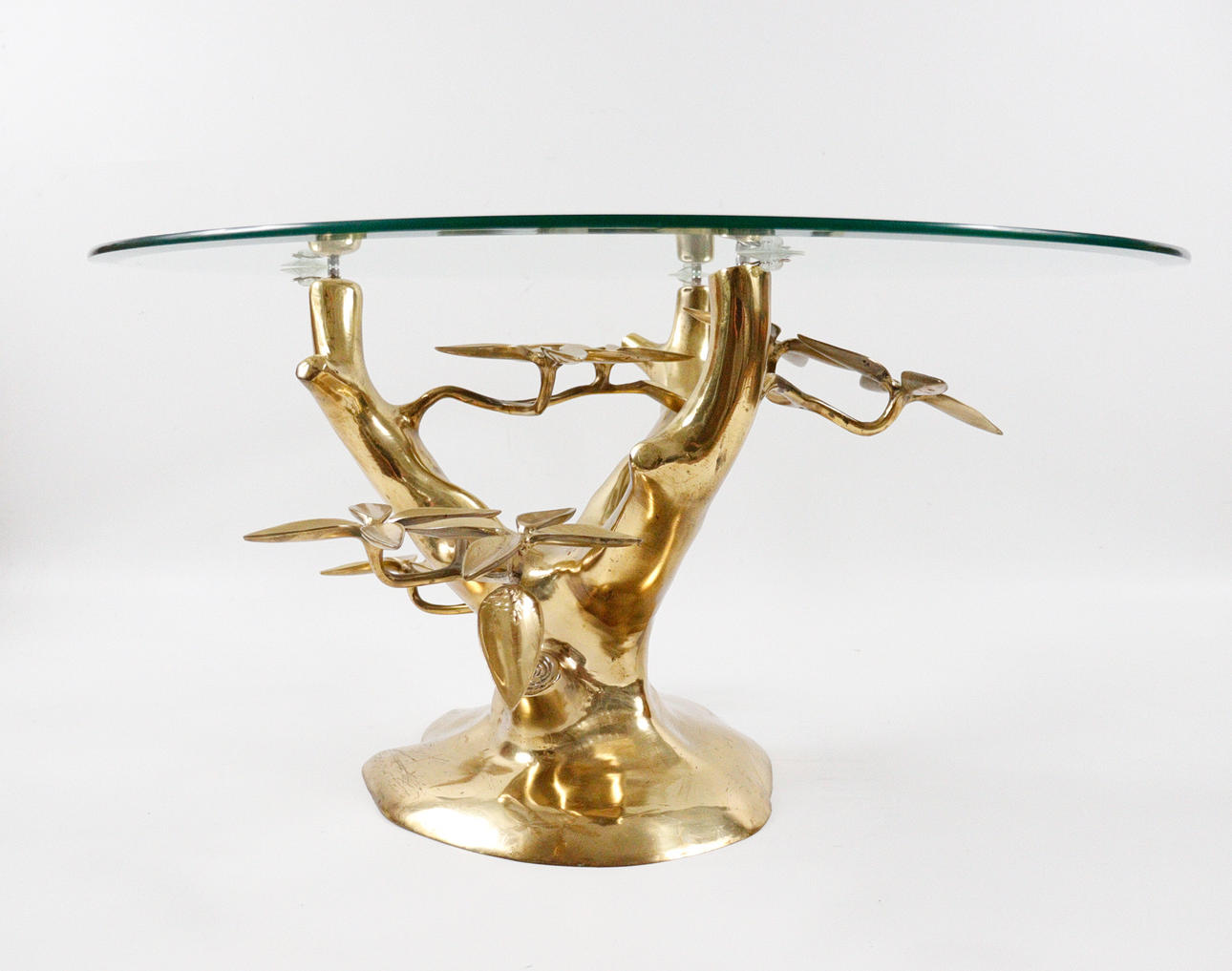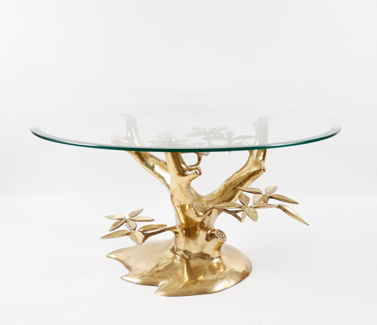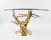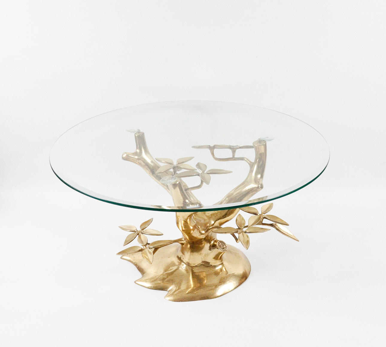 WIlly Daro, mesa de centro, 'Bonsai', años 70, construcción de latón macizo, dorado al fuego, con tapa redonda de cristal, A. 41 cm, Ø: 80 cm.