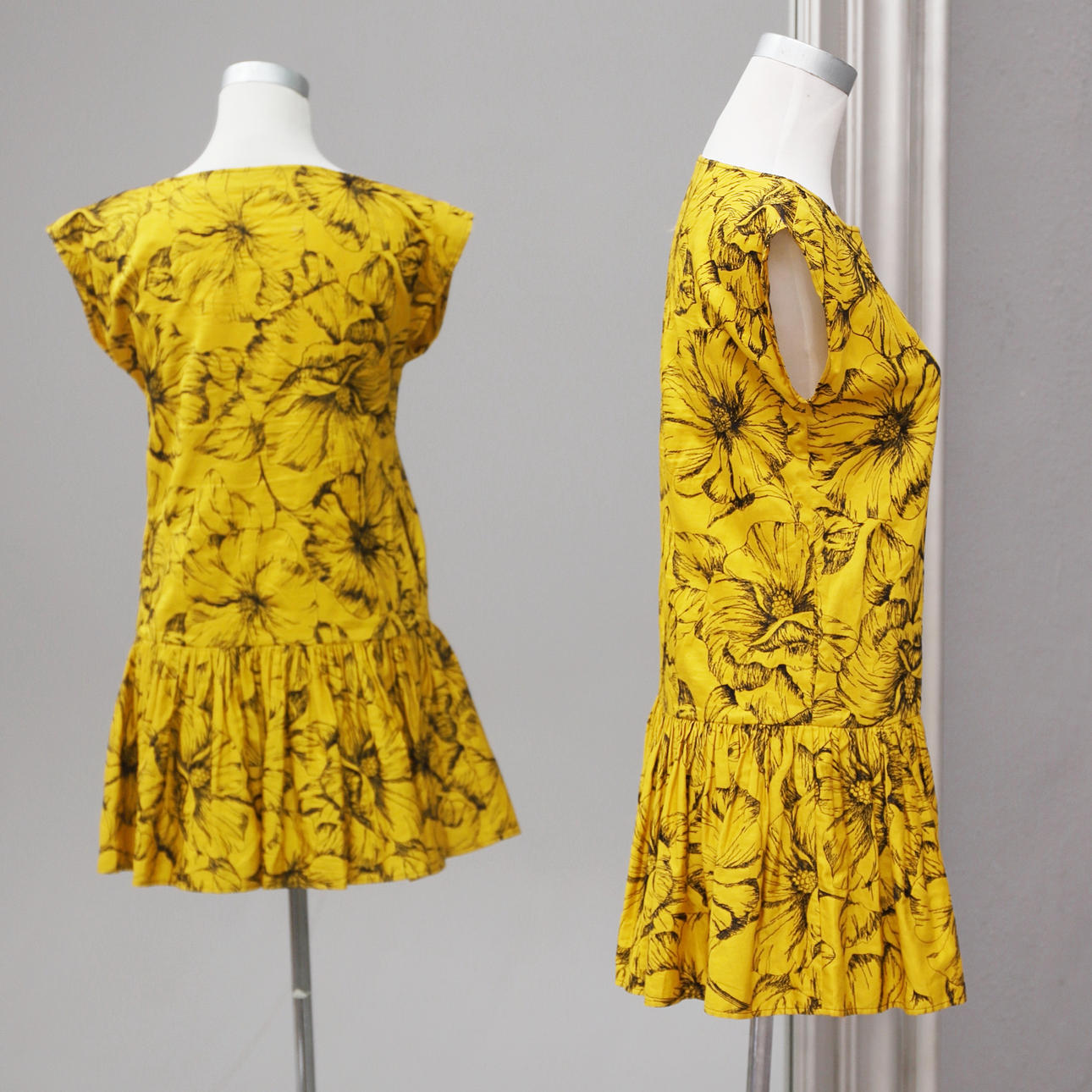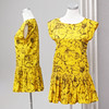 En algodón color mostaza con motivo de hibiscos bordadas en negro. Con bolsillos