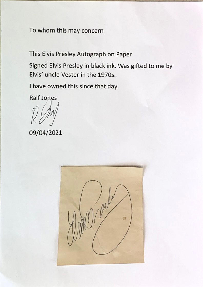 Un papel firmado por Elvis Presley (Americano 1935 -1977) en tinta negra. Este artículo fue un regalo del tío Vester en la década de 1970.