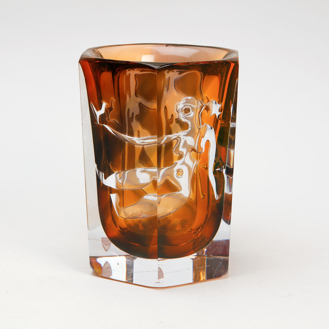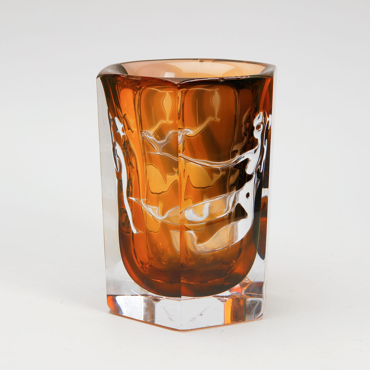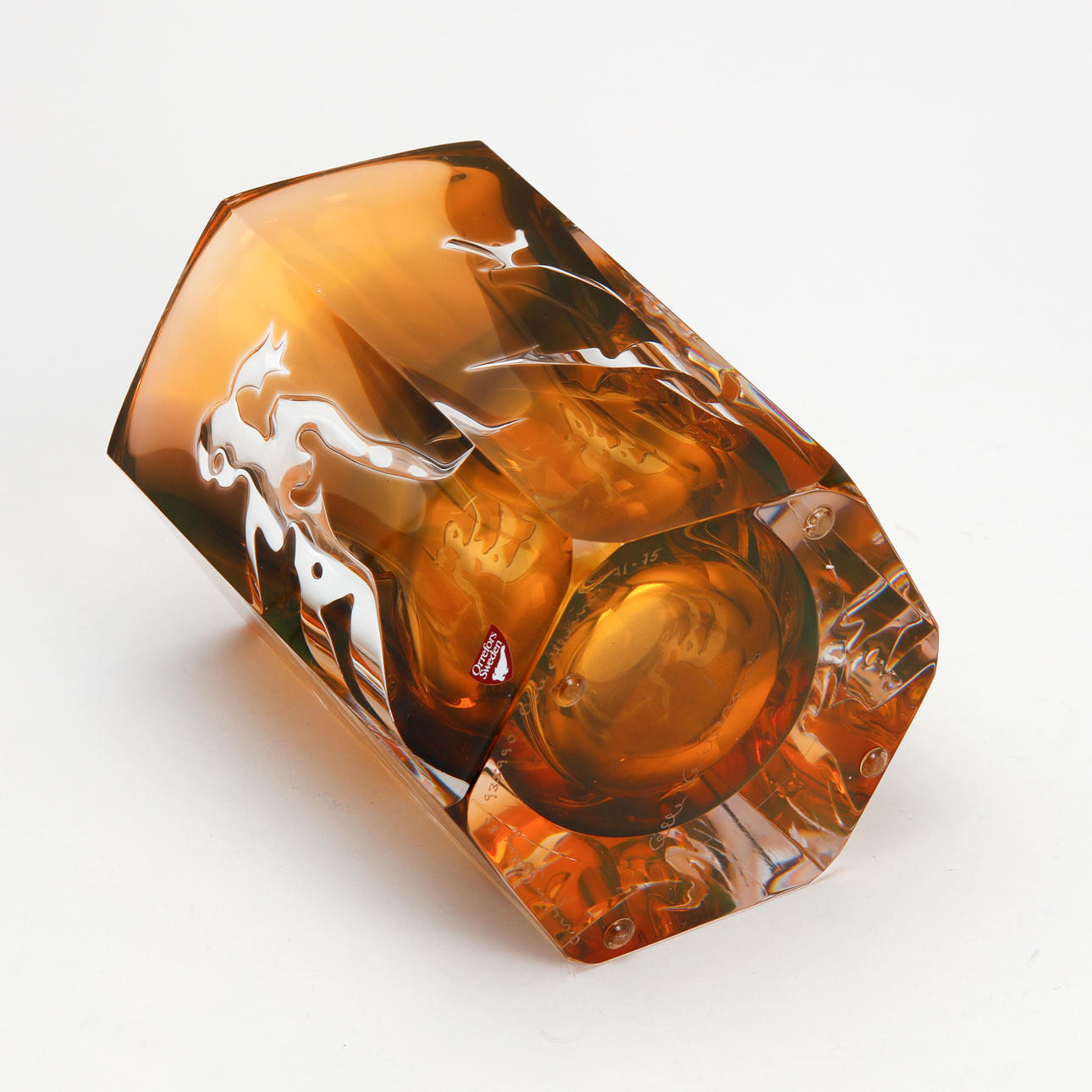 Masa de vidrio color ámbar con decoración de figuras, voladizo de vidrio transparente. Firmado y rotulado "Galería Orrefors -88 935990 Olle Alberius 71 - 75". Altura 17,5 cm.
