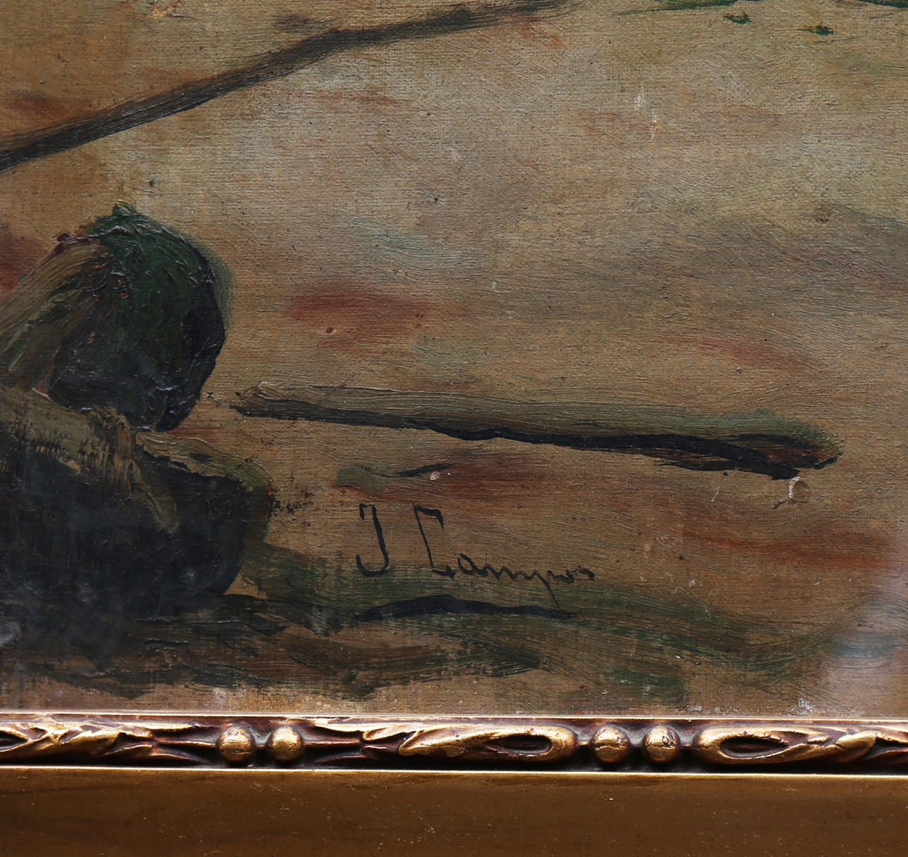 Parches en el reverso y barniz oxidado. Marco en madera moldurada y dorada.