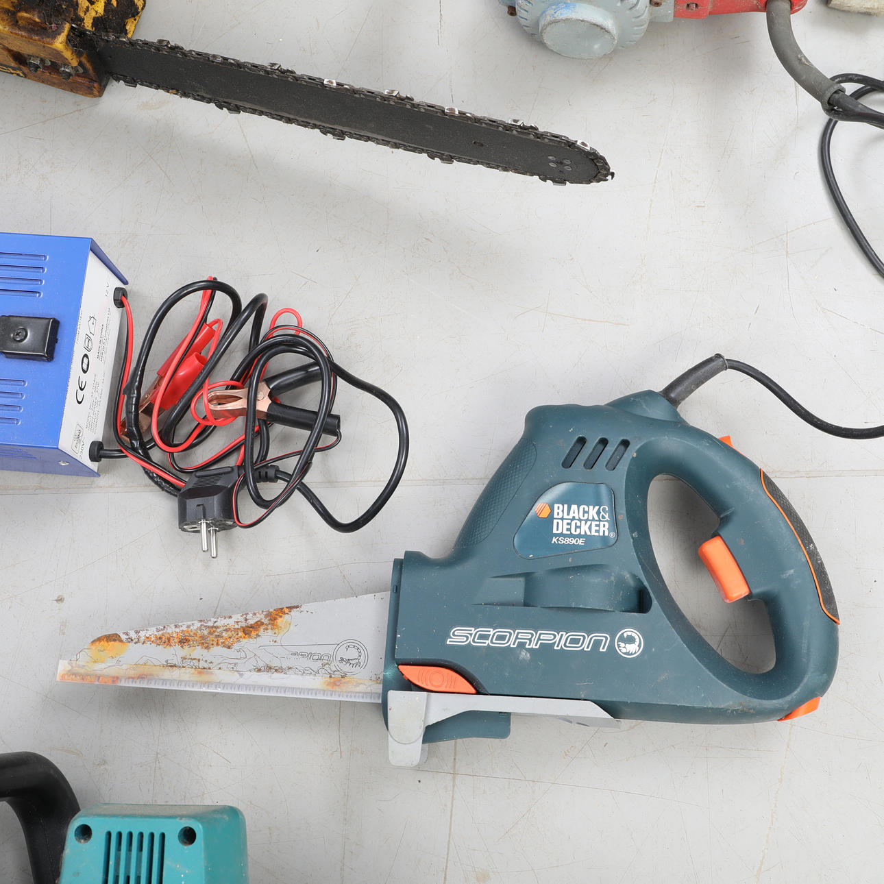 Tijeras cortasetos Black and Decker longitud total aproximadamente 73 cm longitud de la tijera aproximadamente 43 cm Taladro de impacto Hilti TE17 longitud aproximadamente 42 cm Motosierra McCullock PM 374 longitud de la hoja aproximadamente 34 cm Black and decker KS890E Scorpion hoja aproximadamente 19 cm Sierra de calar Bosch Domkraft AB NIKE Hydraulik Eskilstuna Batería de 2 toneladas cargador mvp superline.