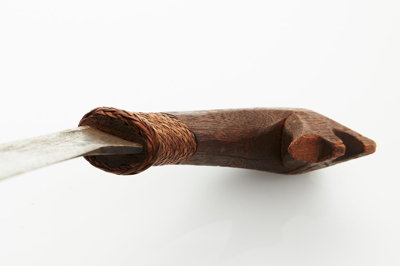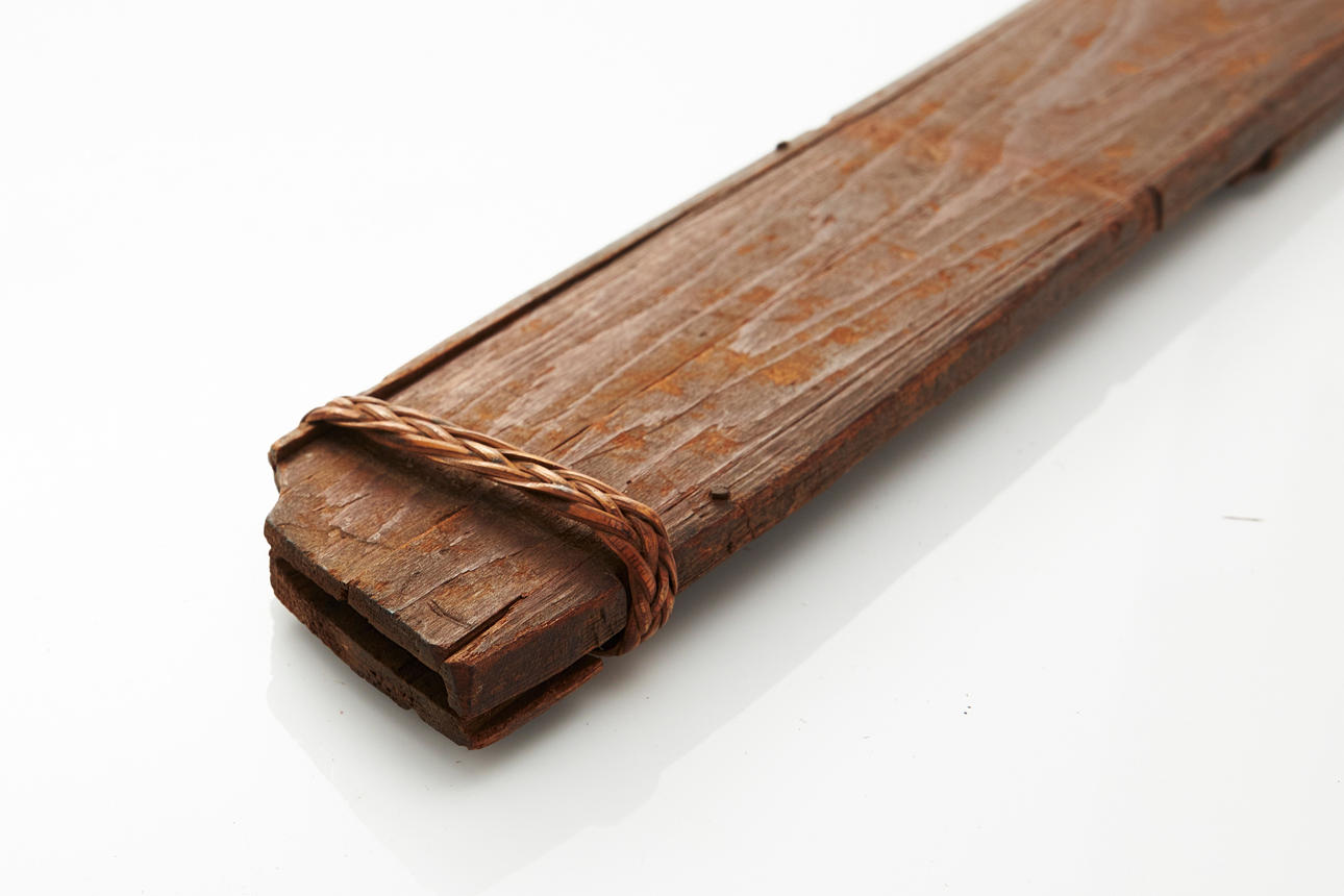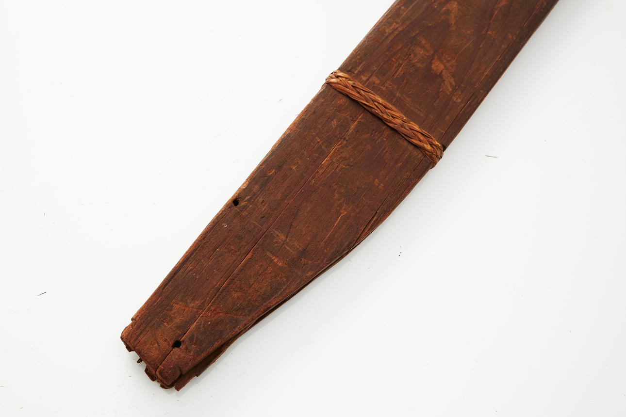 Soporte de madera esculpido, tina de madera con bandas trenzadas, longitud aproximada de 56 cm.