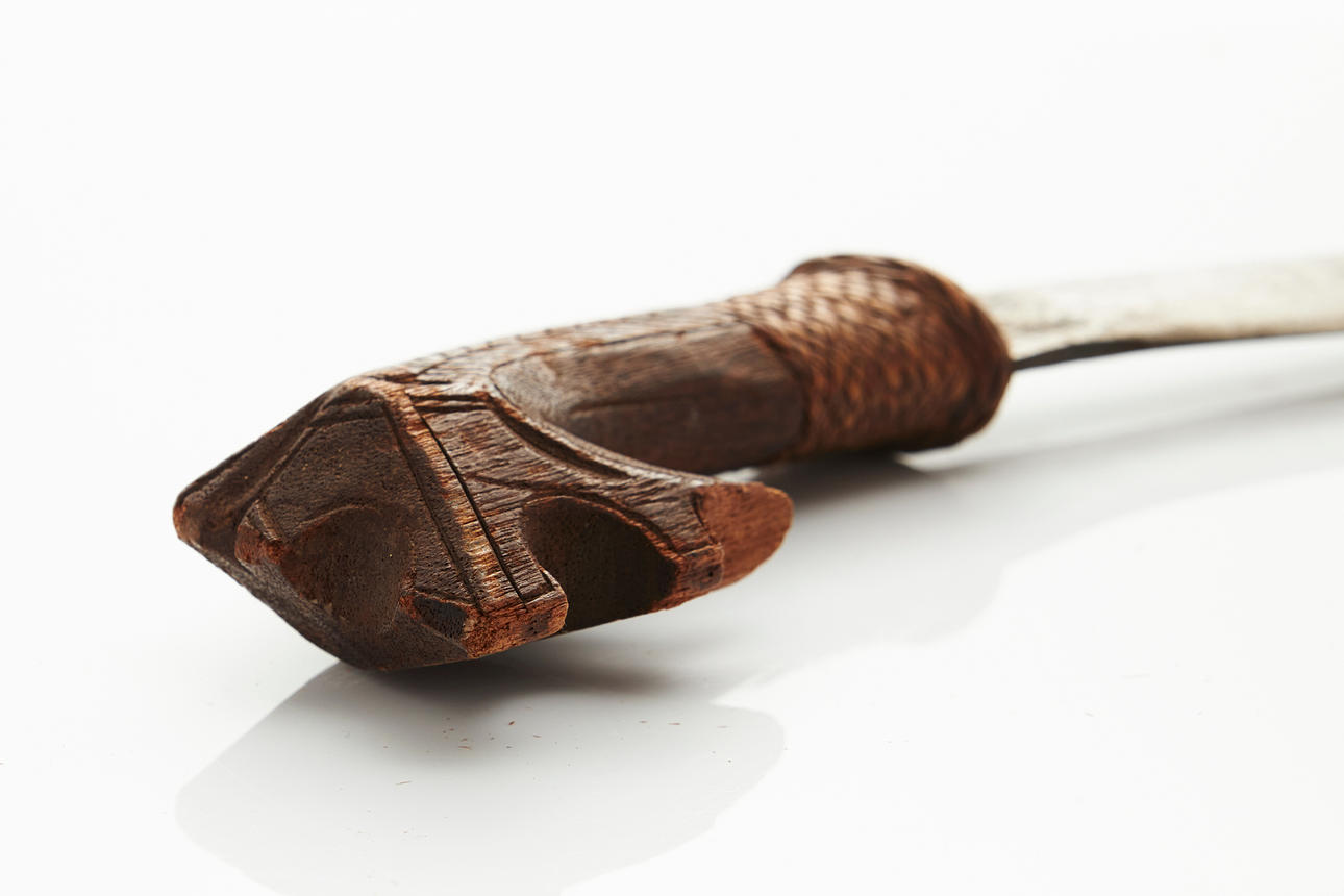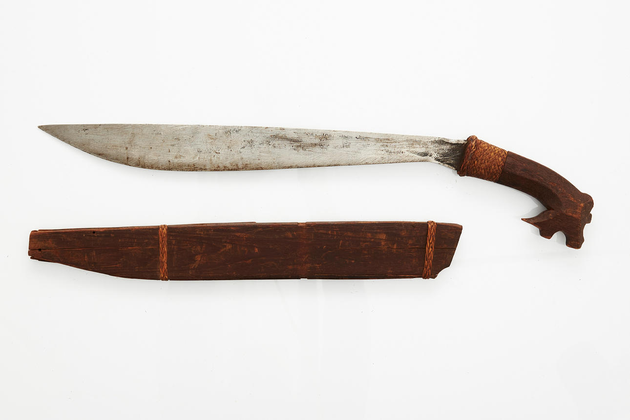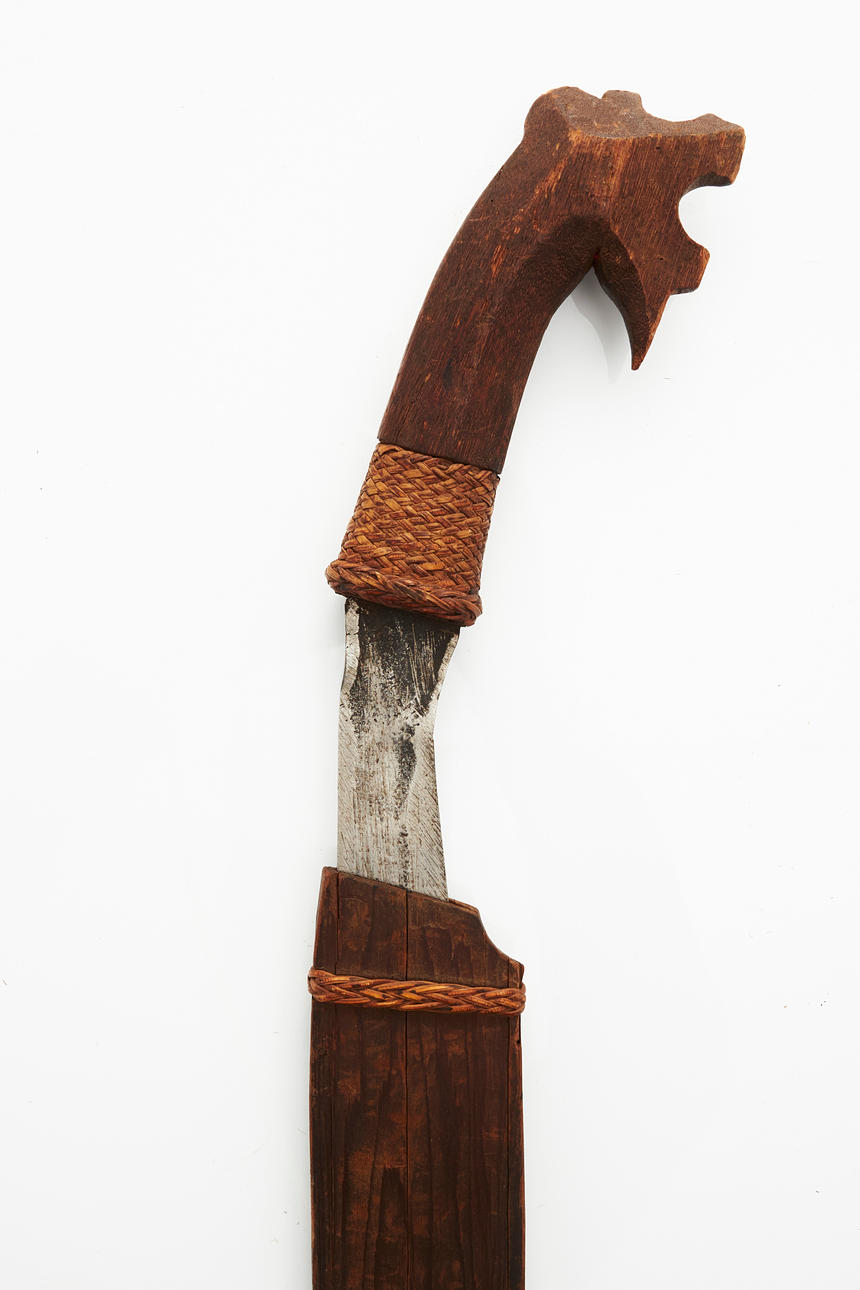 Soporte de madera esculpido, tina de madera con bandas trenzadas, longitud aproximada de 56 cm.