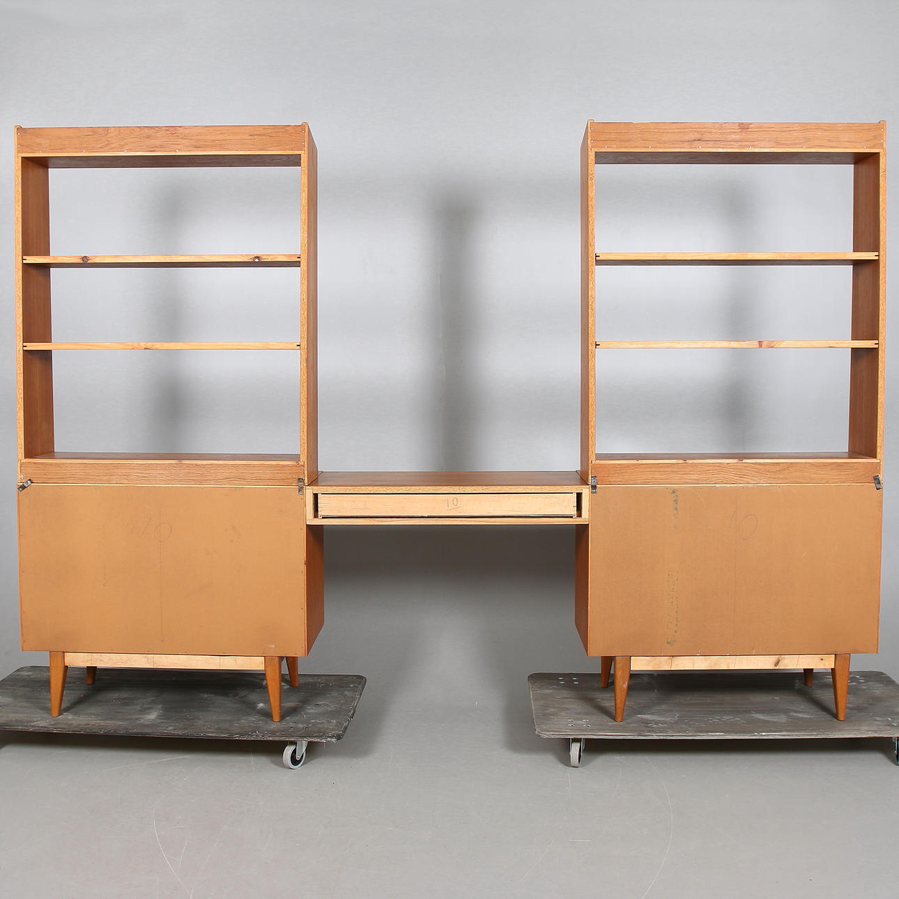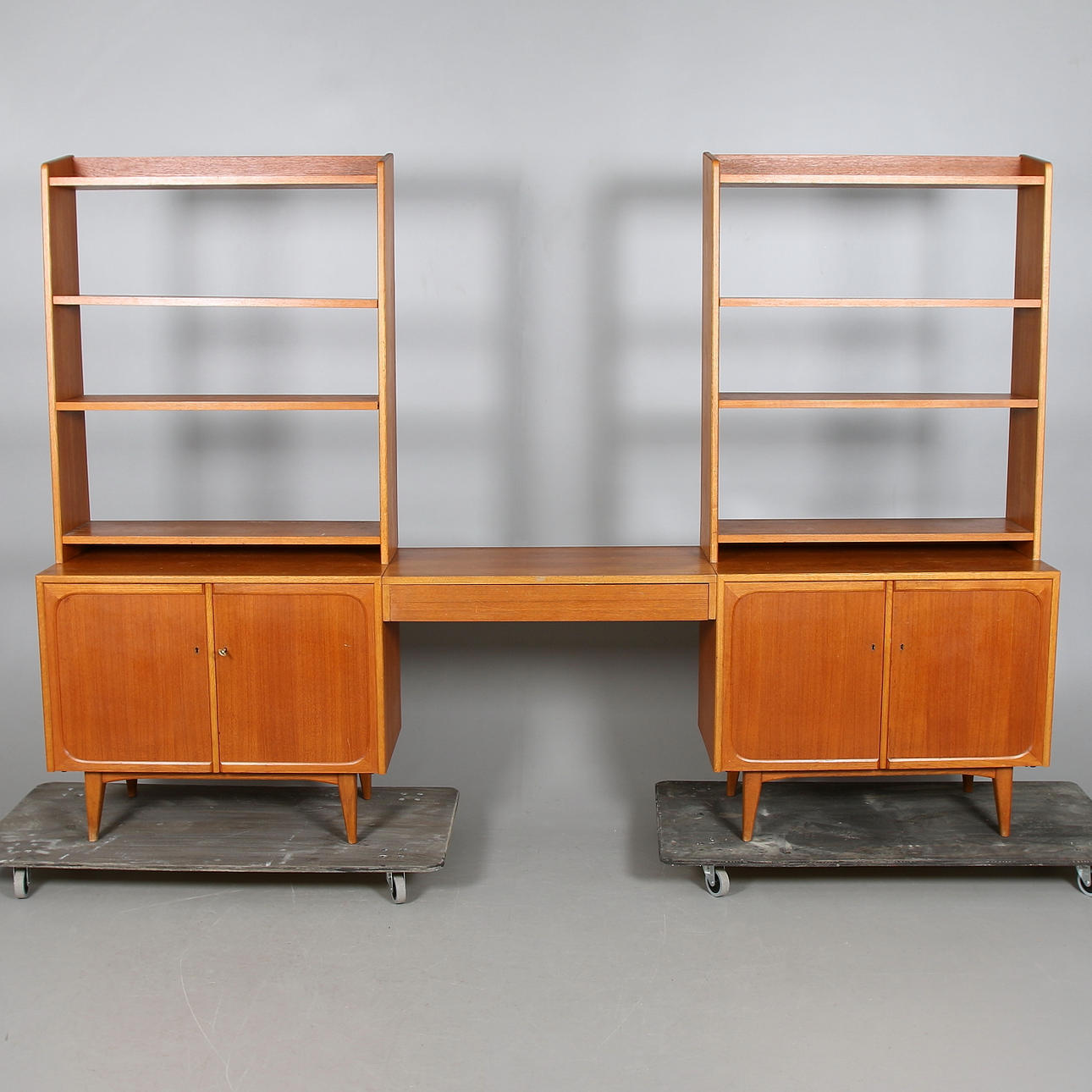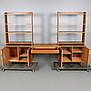 Teca. 2 estantes con mueble bajo, superficie de mesa en el centro con cajón. Ancho total 350, fondo 40, alto 173 cm.