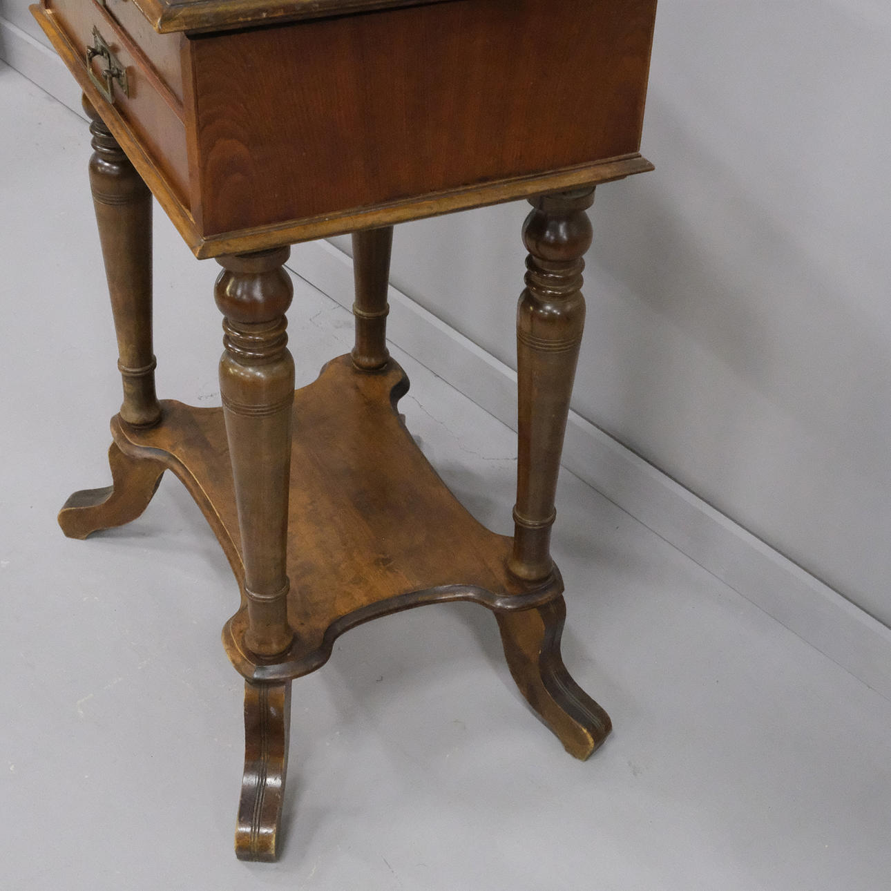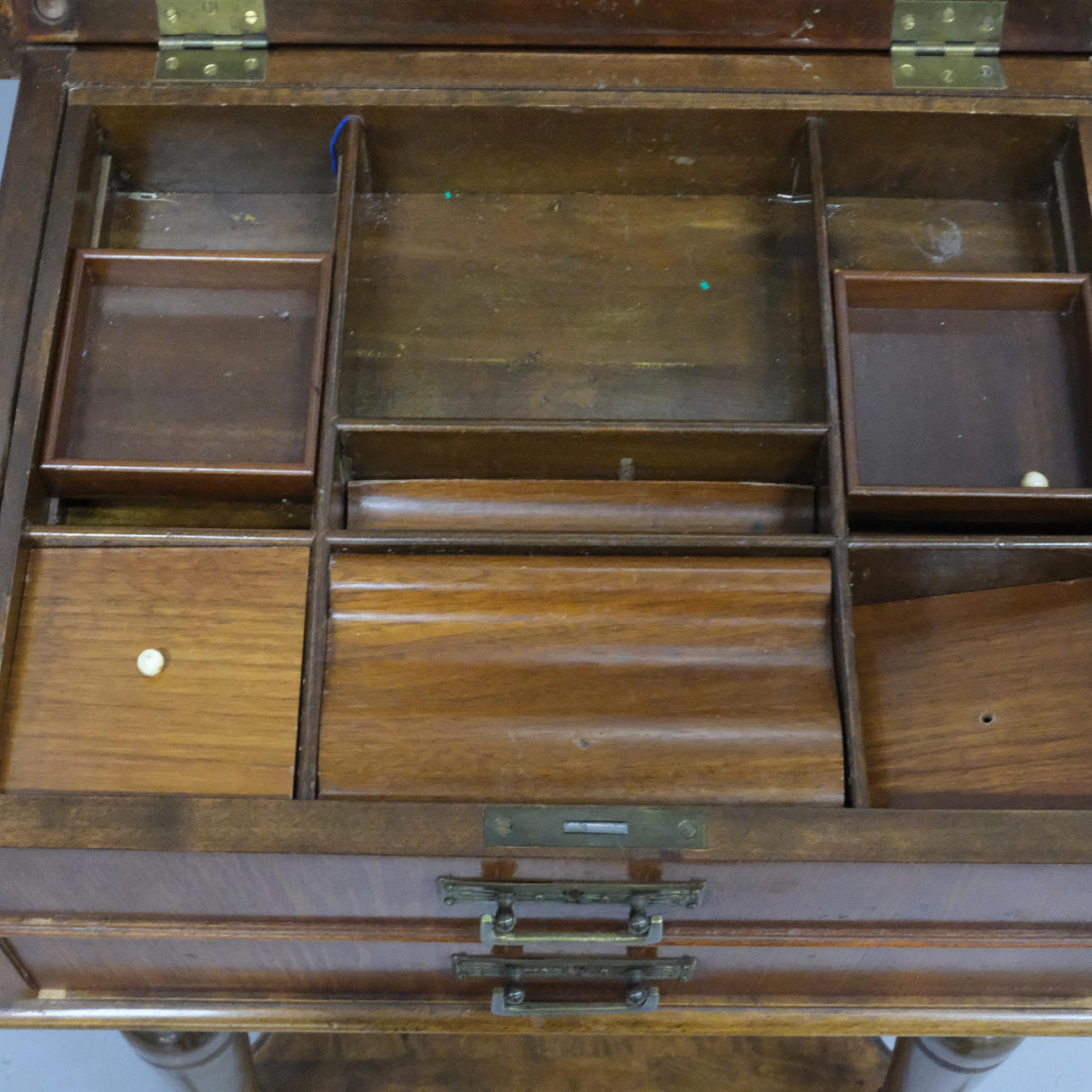 Interior con compartimento en uno de dos cajones, herrajes de latón, alto 80 cm, largo 52 cm, profundidad 41 cm.