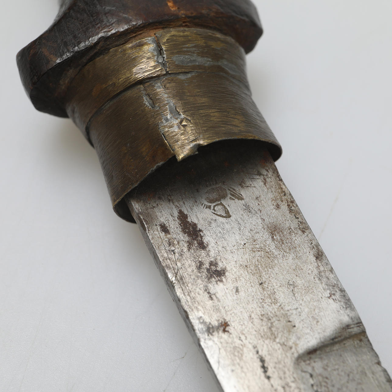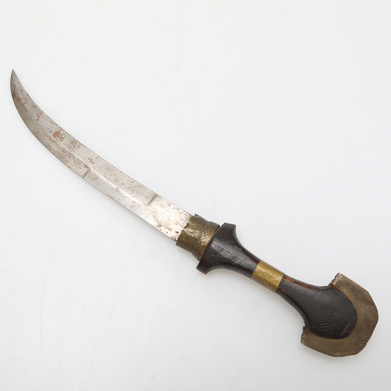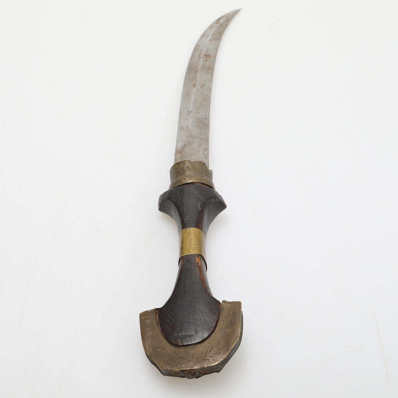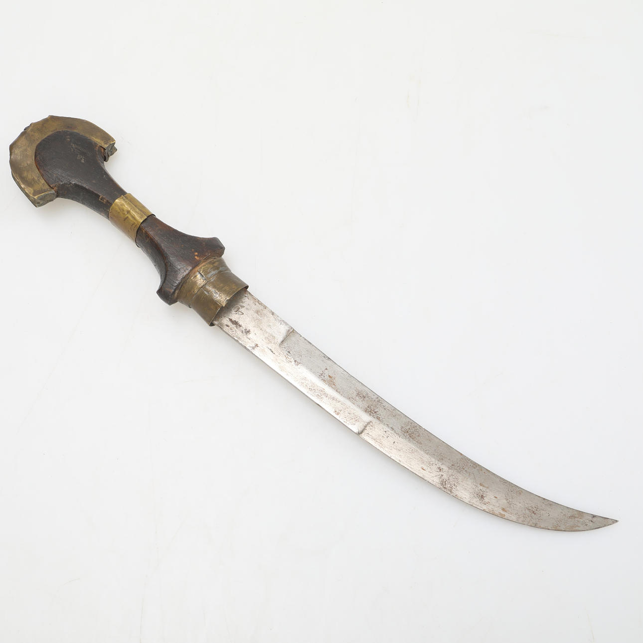 El mango está hecho de madera oscura con adornos de latón.