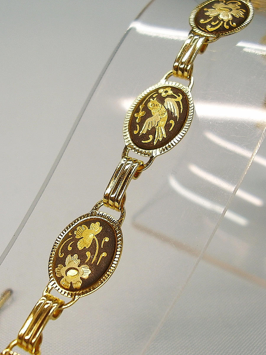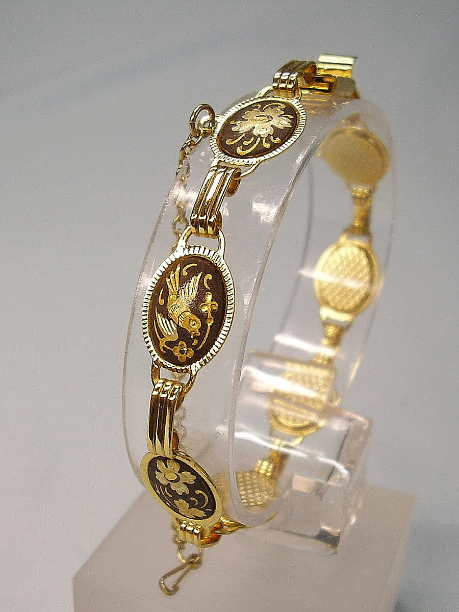El elegante brazalete Toledo consta de siete medallones ovalados con representaciones de flores y pájaros.