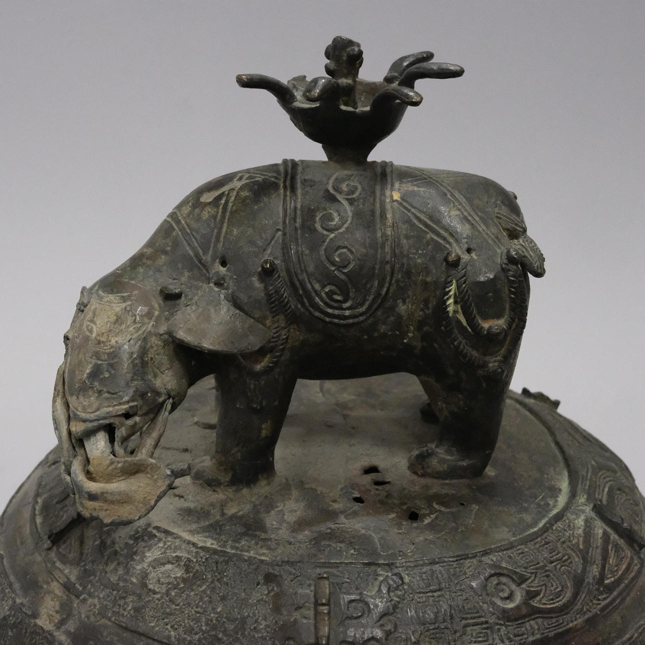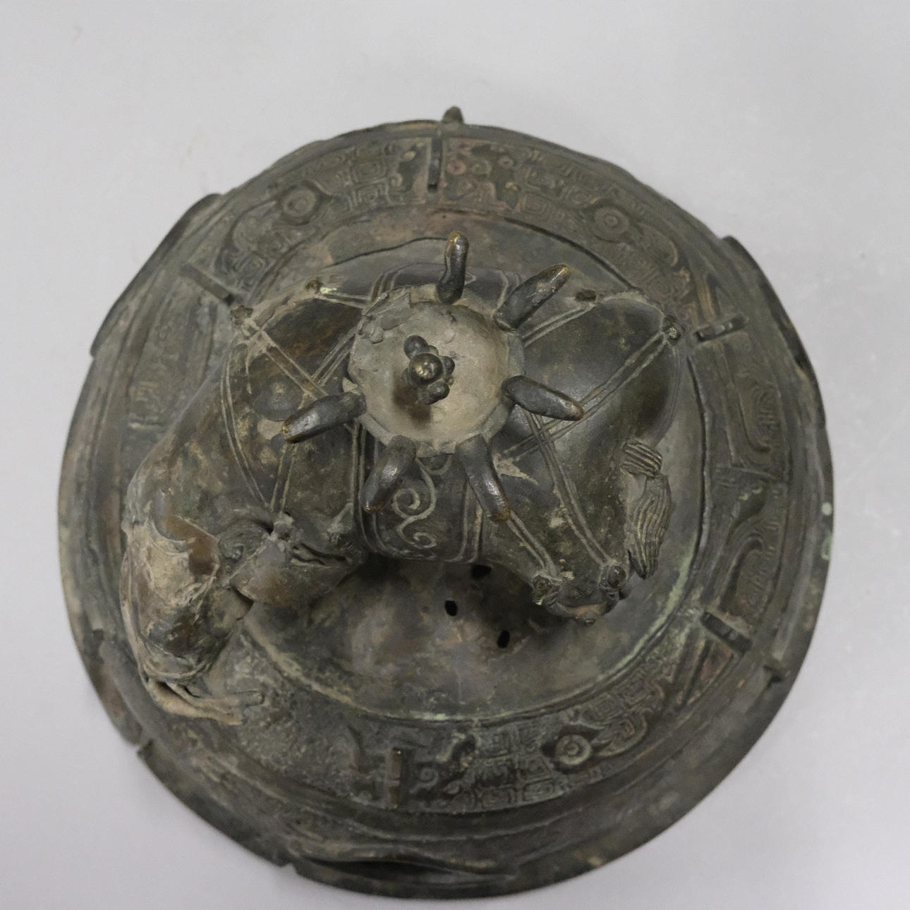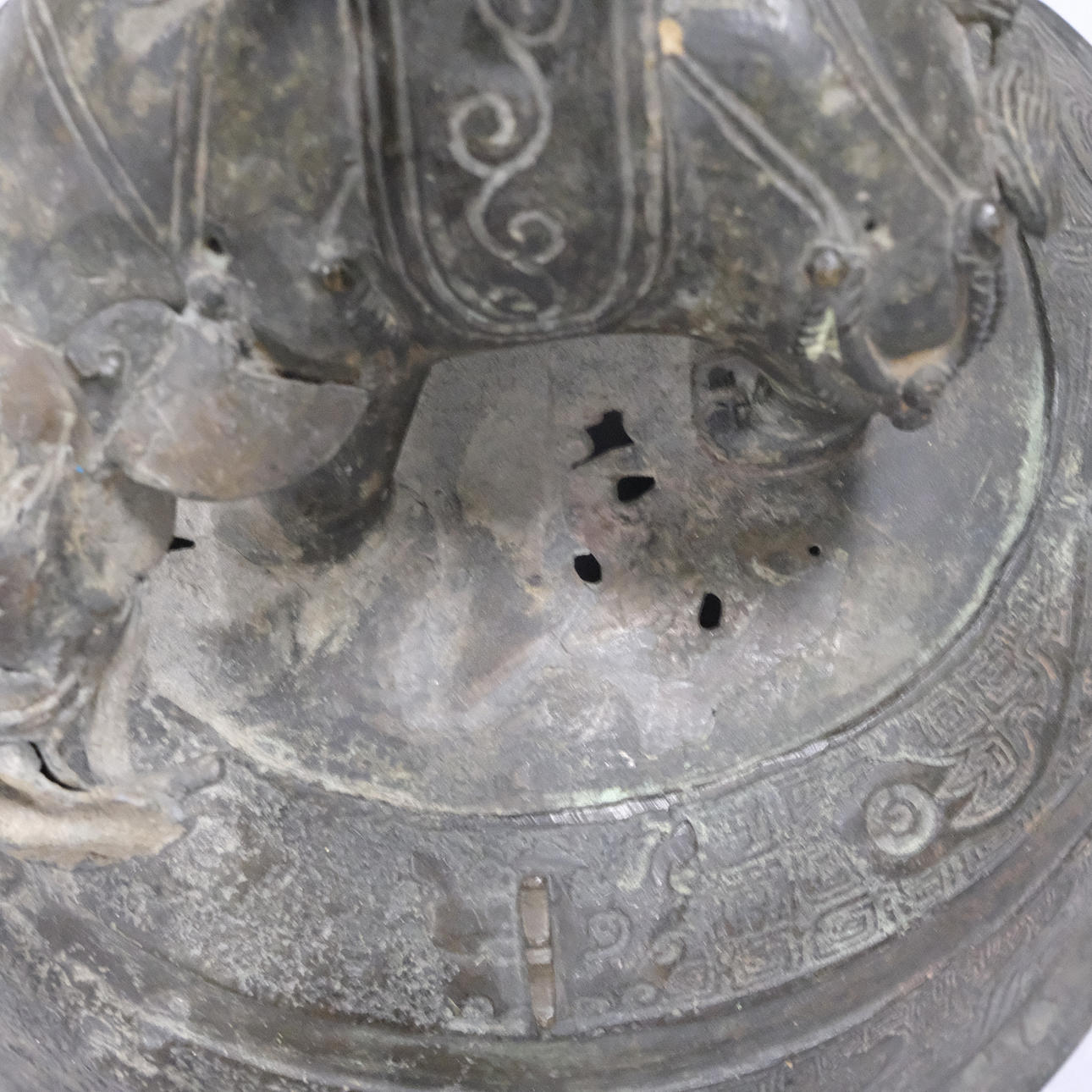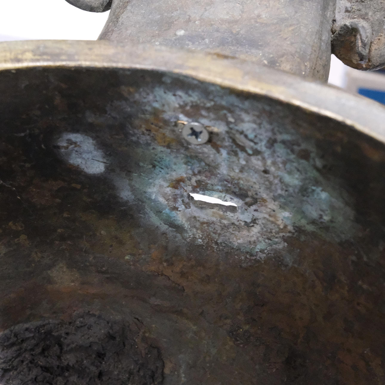Bronce con daños y detalles decorativos sueltos. Manchas y agujeros. Decoración de tapa con reparación.