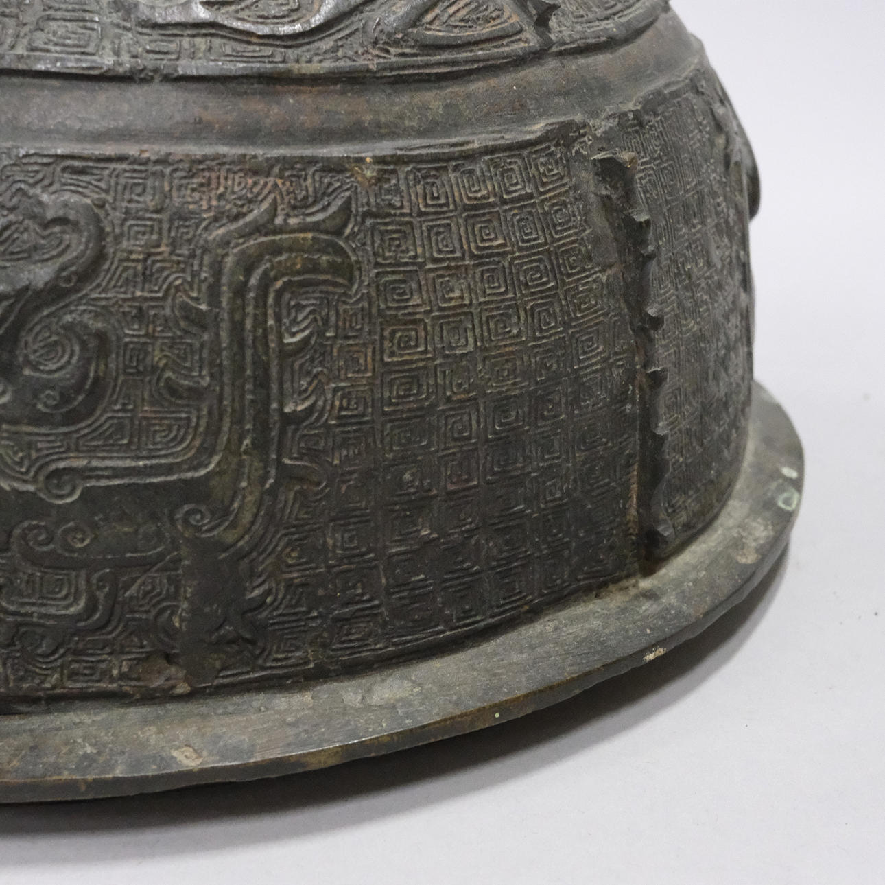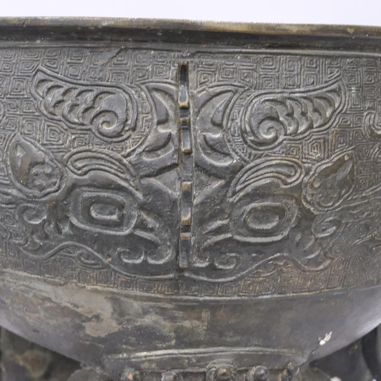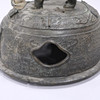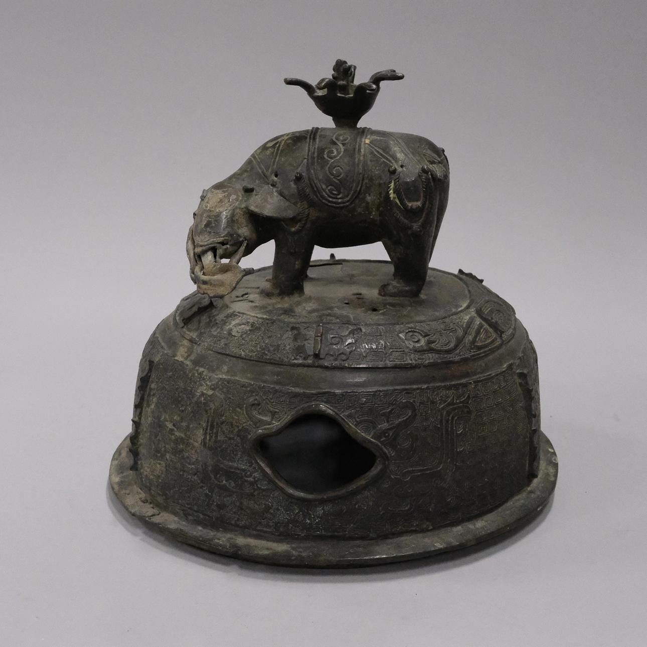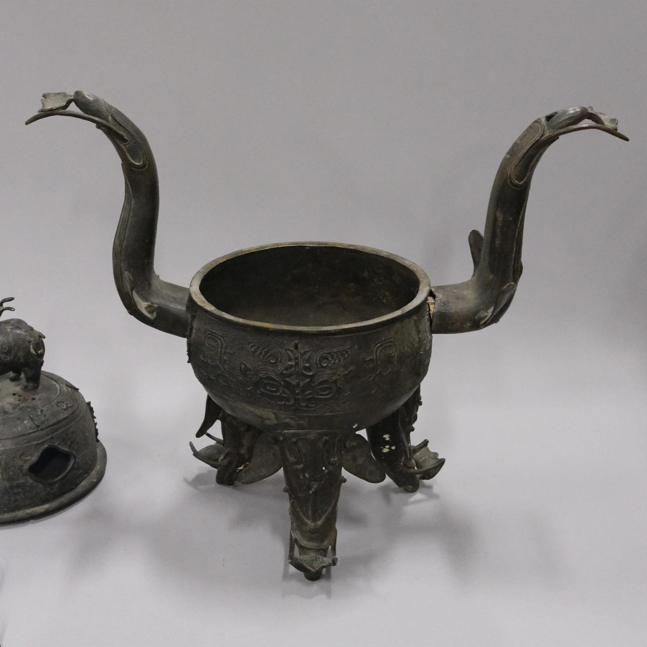 Bronce con daños y detalles decorativos sueltos. Manchas y agujeros. Decoración de tapa con reparación.