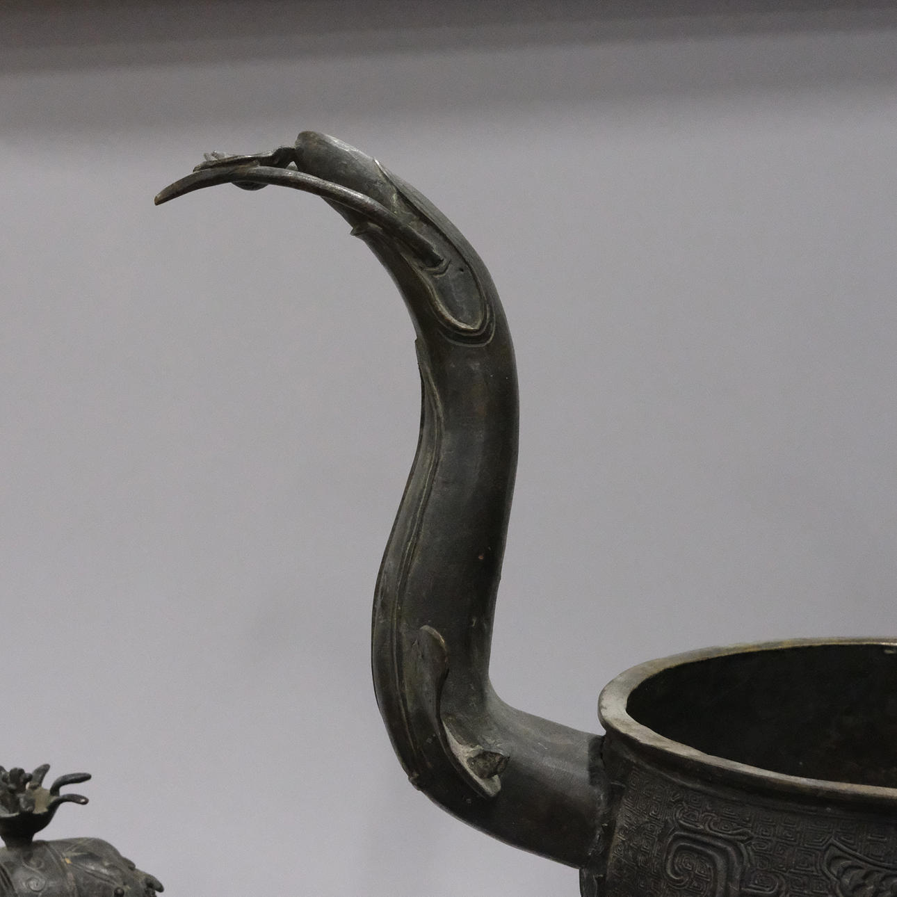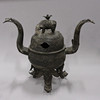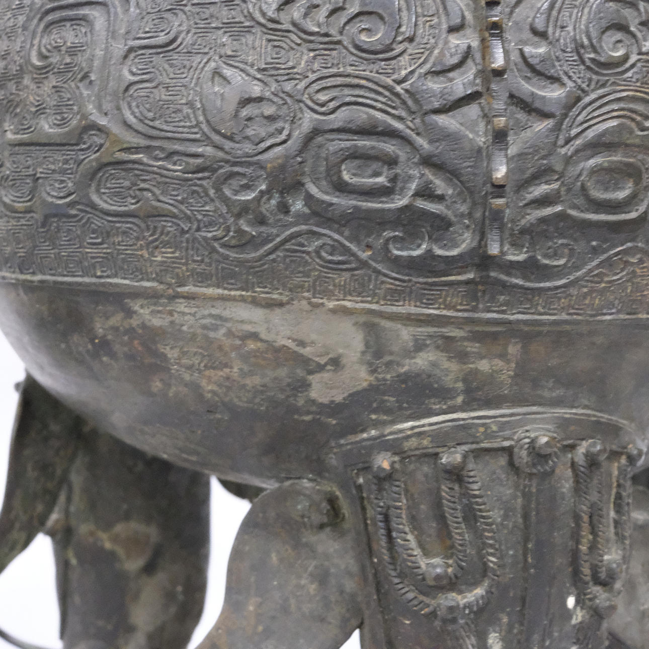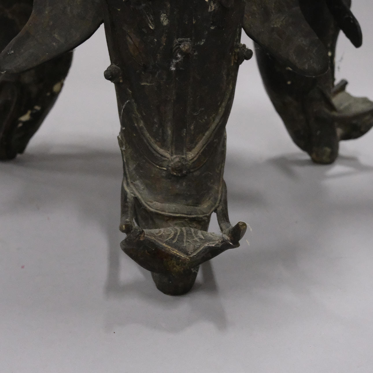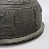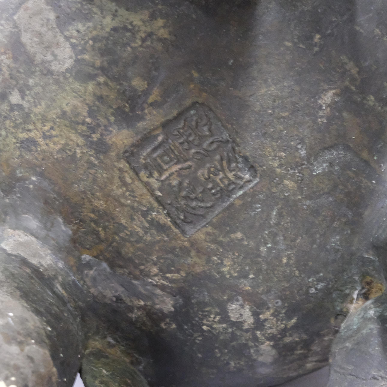 Bronce con daños y detalles decorativos sueltos. Manchas y agujeros. Decoración de tapa con reparación.