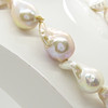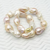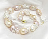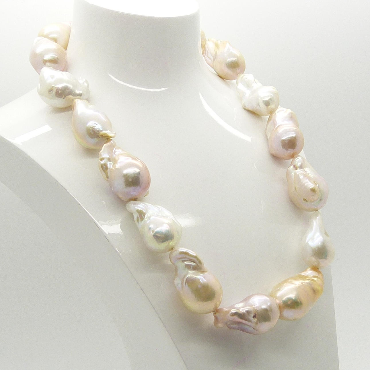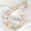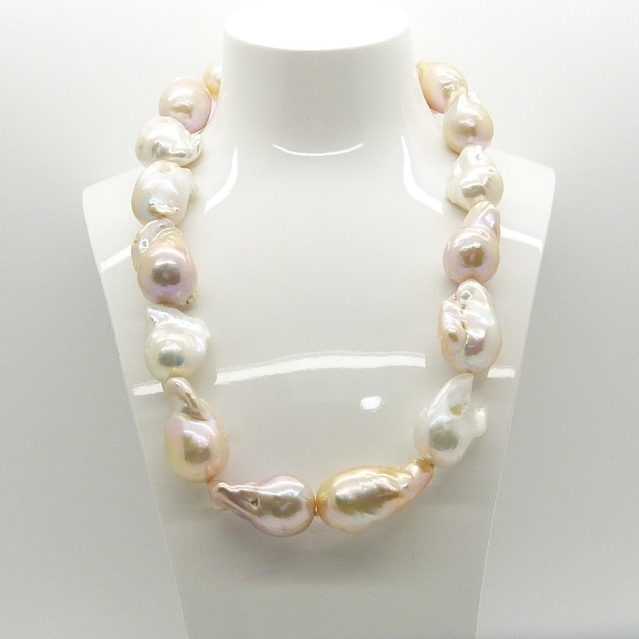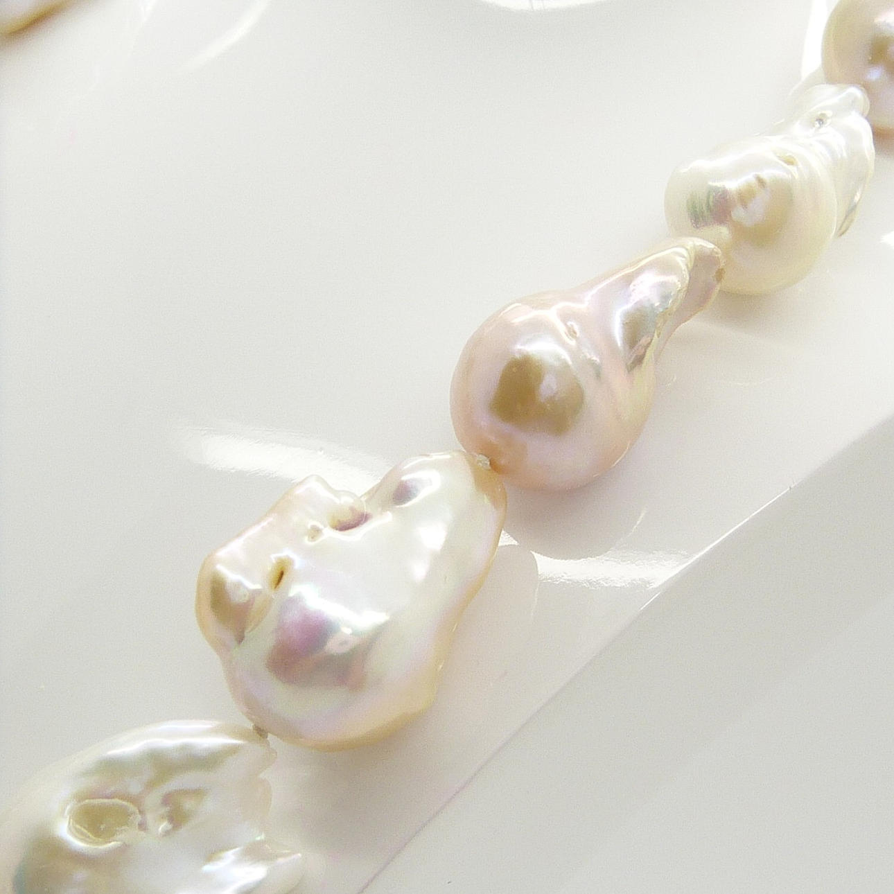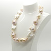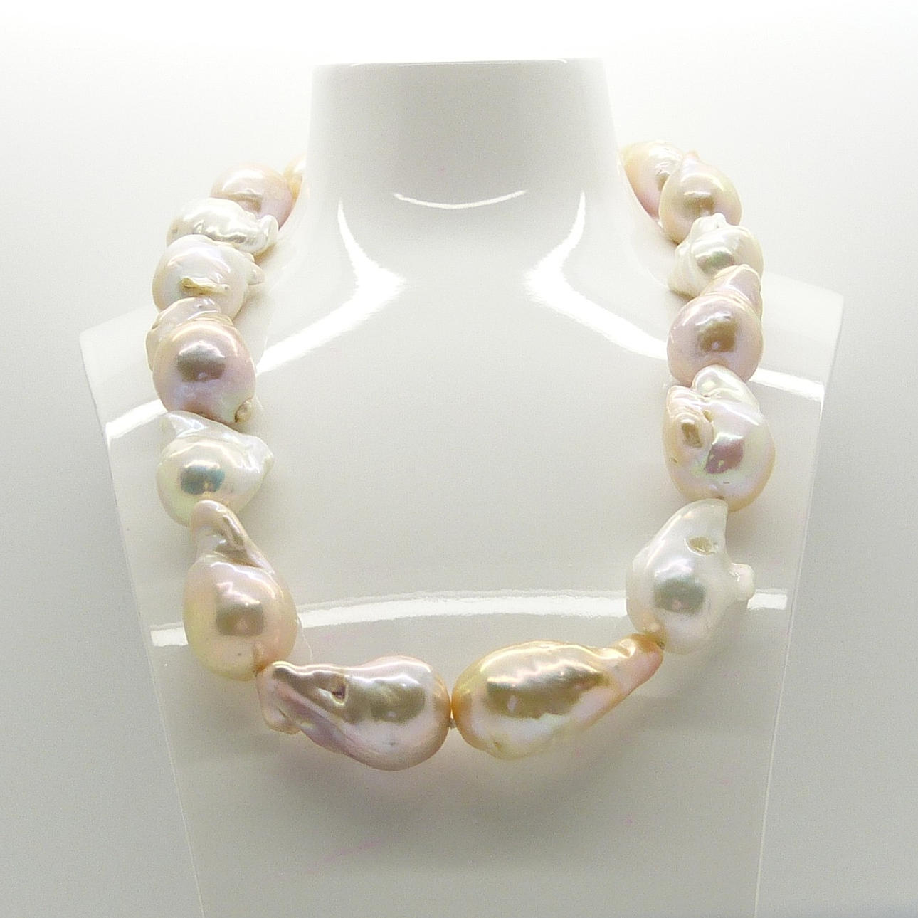 Un collar inusual ensartado con grandes perlas barrocas naturales de agua dulce en tonos champán, blanco y melocotón, con un cierre de bola de oro blanco.