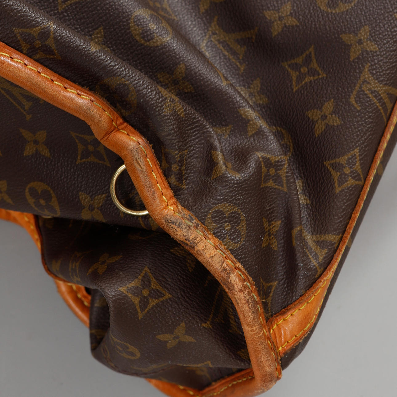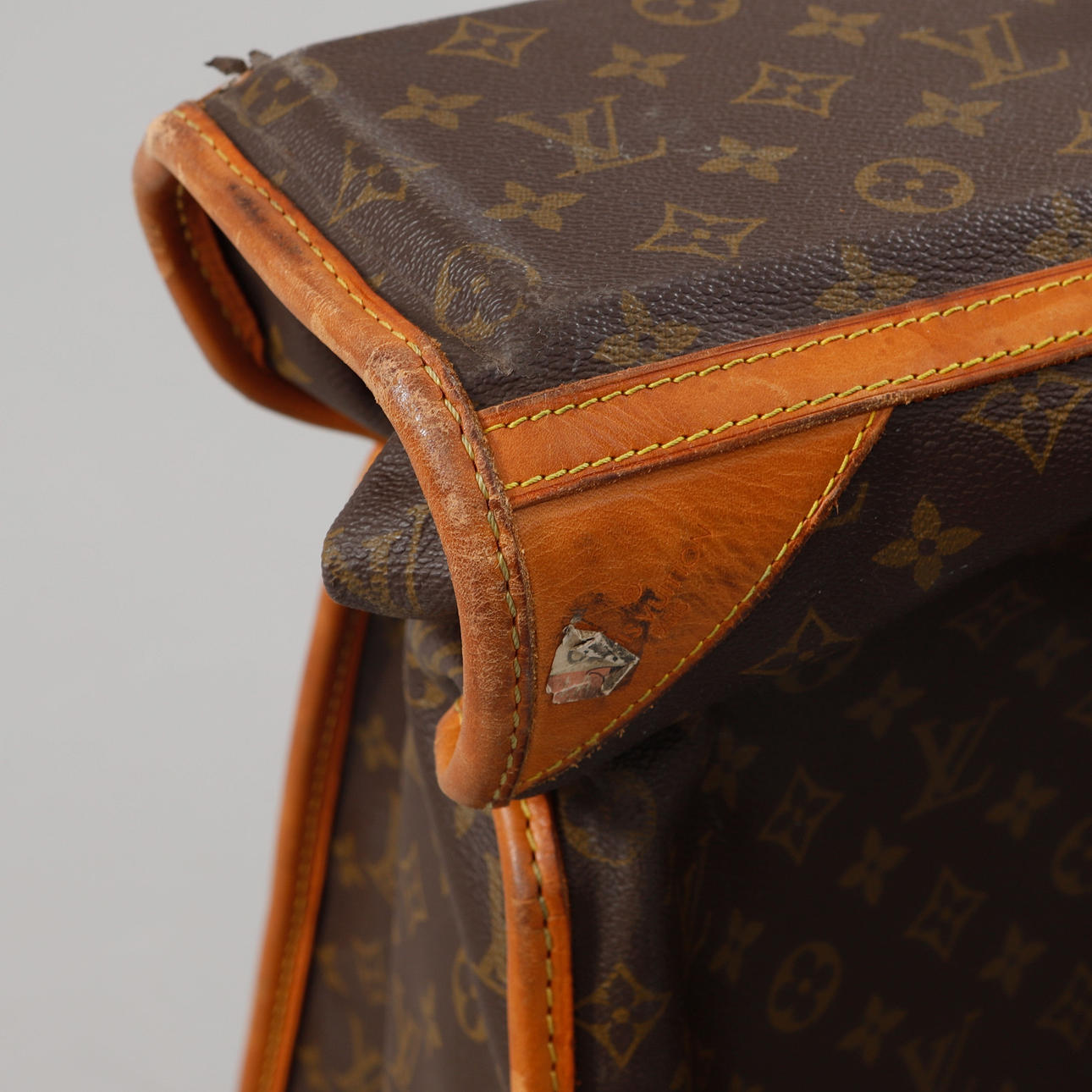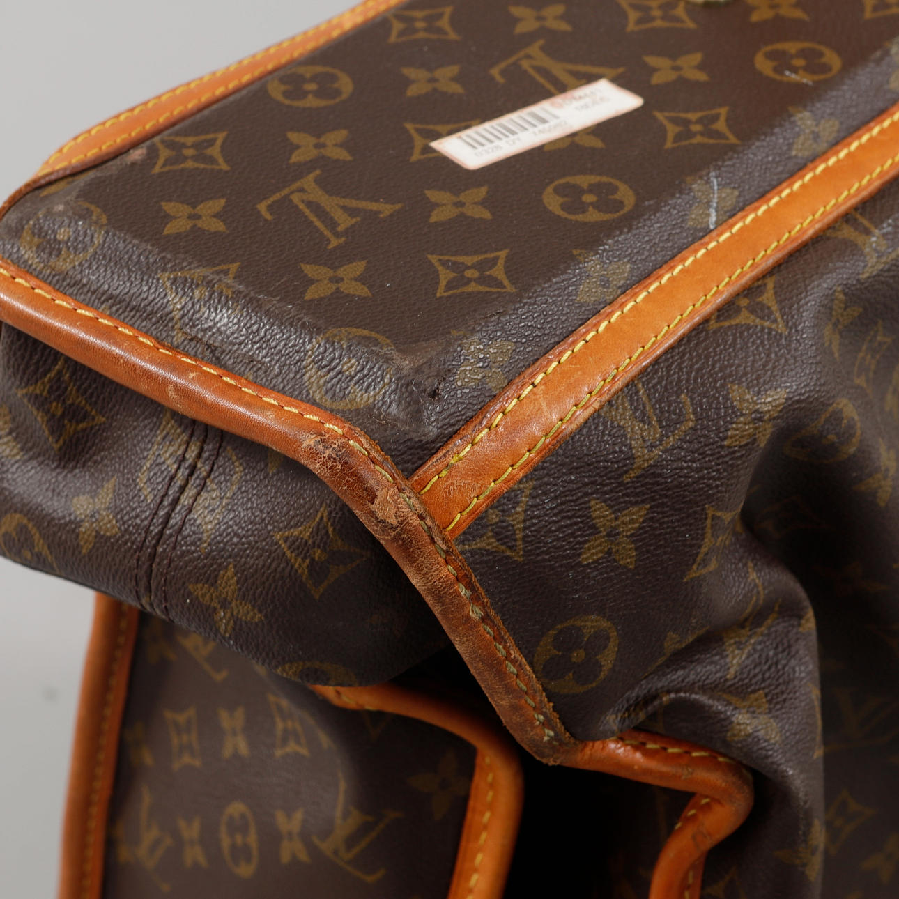 Asa recién cambiada. Forro suelto en costura. Desgaste y marcas. Esquinas y bordes con daños.