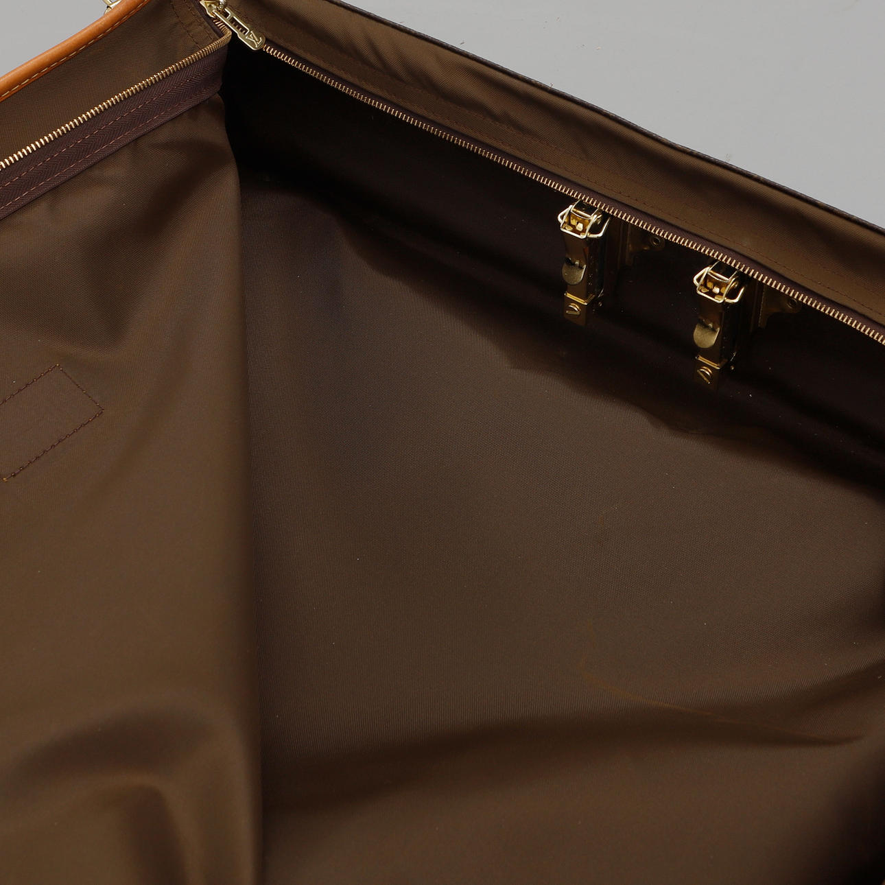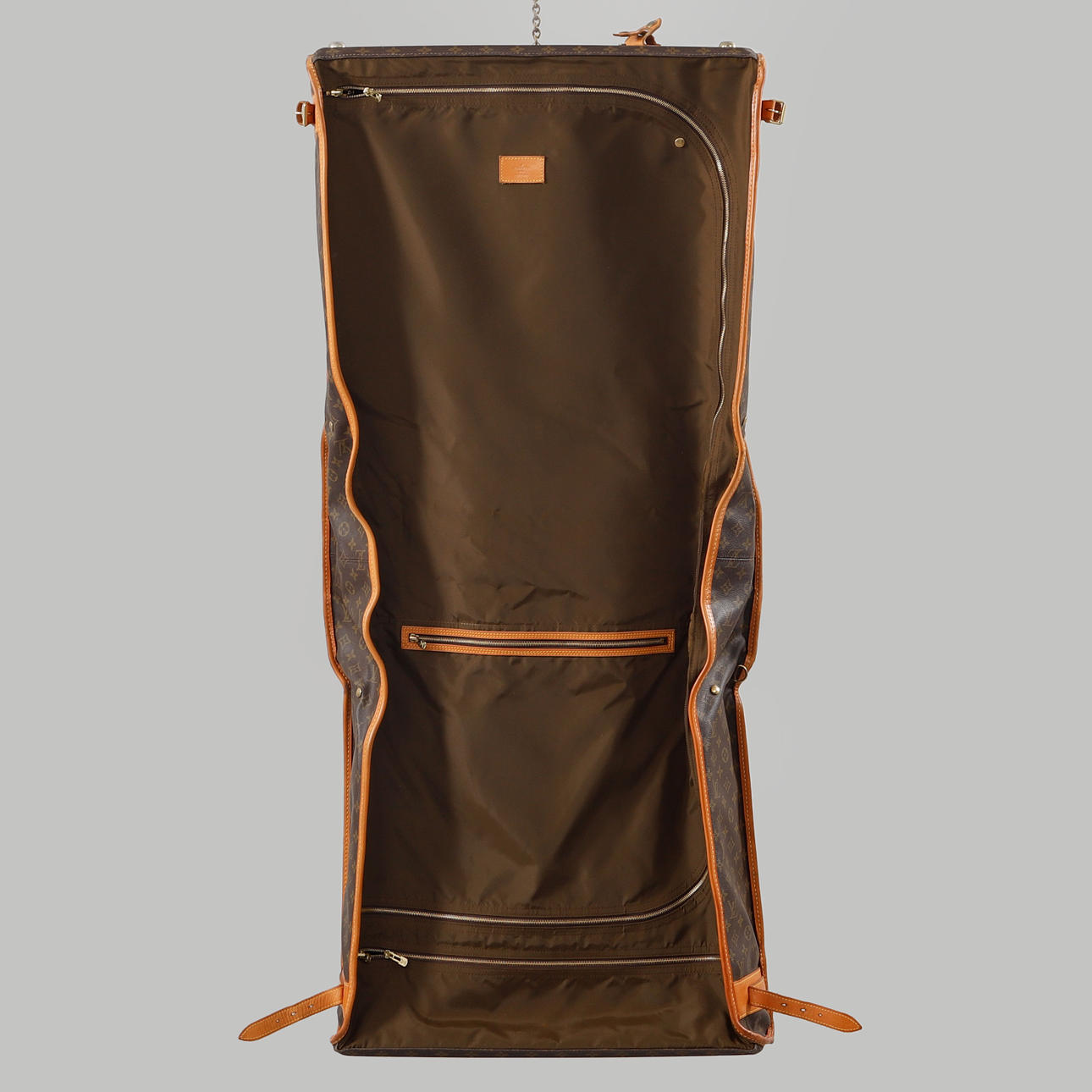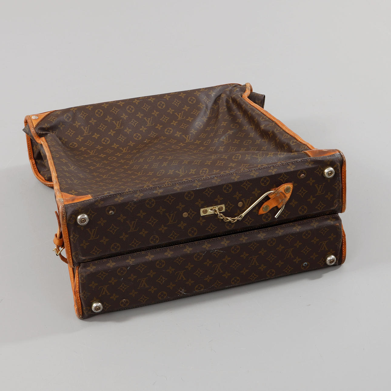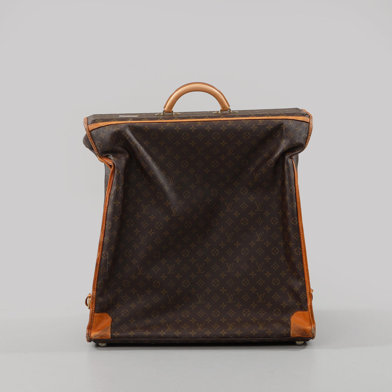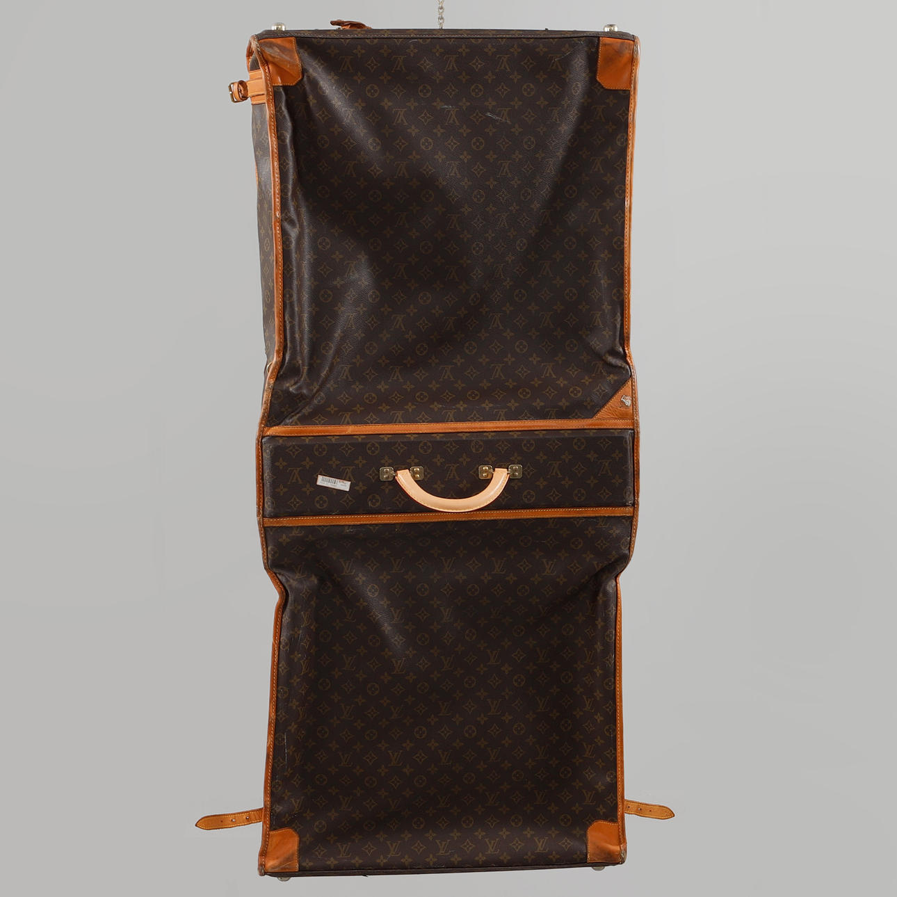 Bolso/ropa de viaje en lona estampada Monogram con detalles en piel y metal amarillo. 3 compartimentos, uno de los cuales tiene dos soportes para perchas. Marcado Louis Vuitton Paris hecho en EE. UU. Largo total desplegado 125 cm aprox. Ancho 60 cm, profundidad 15 cm aprox.