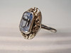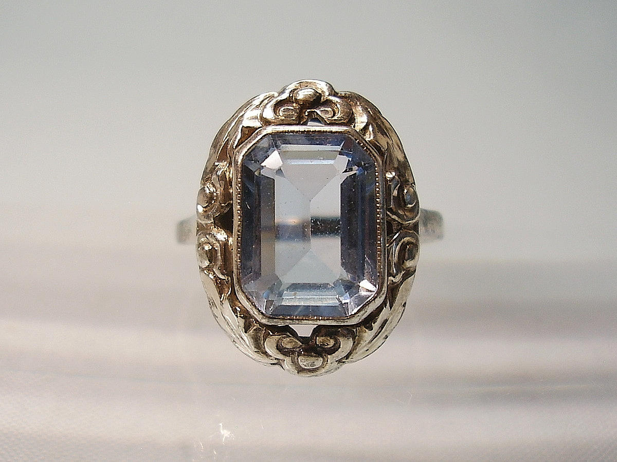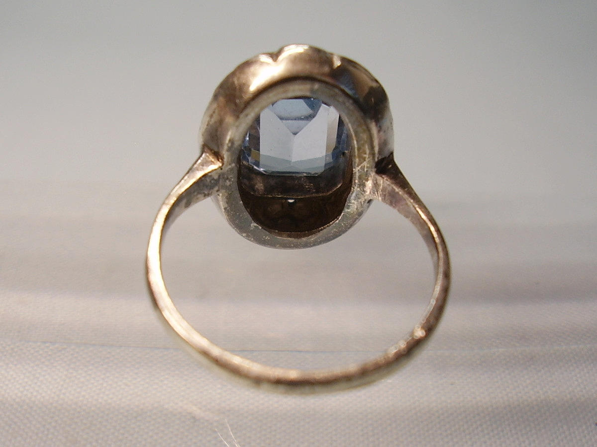 Está engastado con una espinela sintética azul claro facetada octogonal.