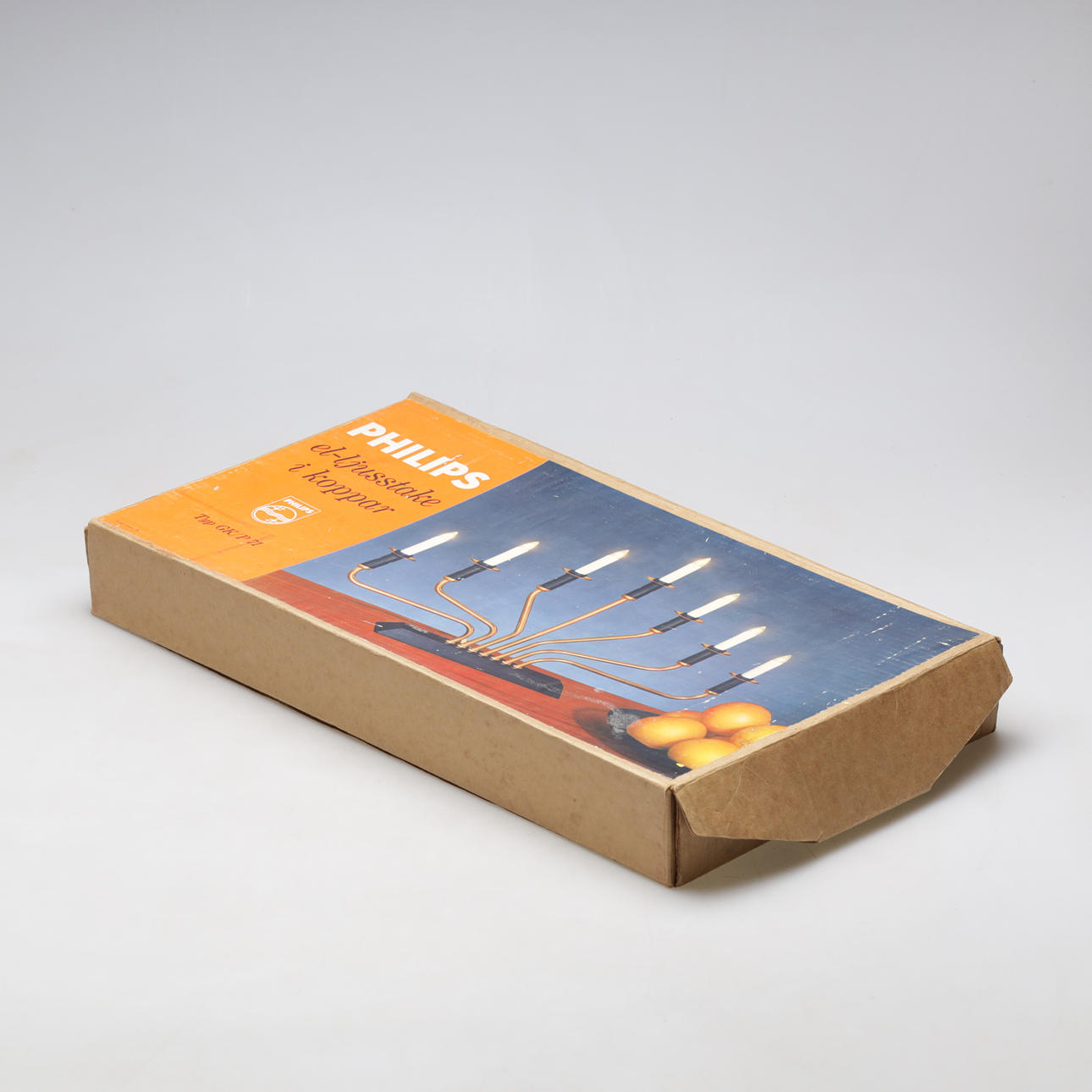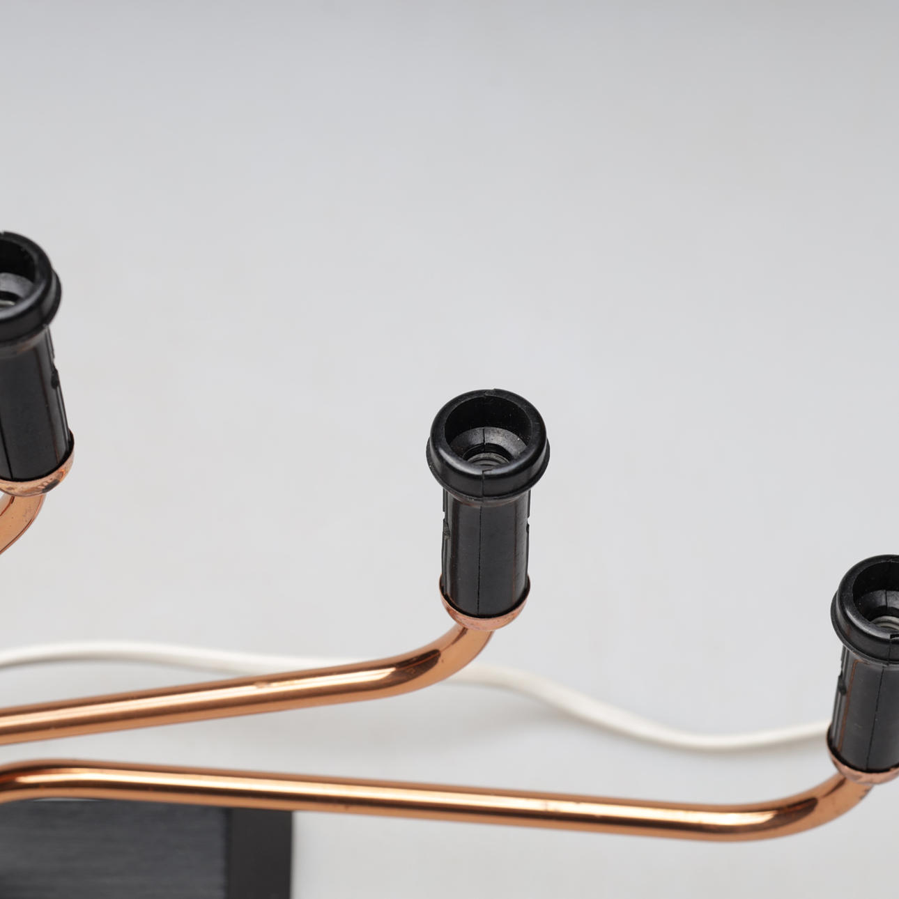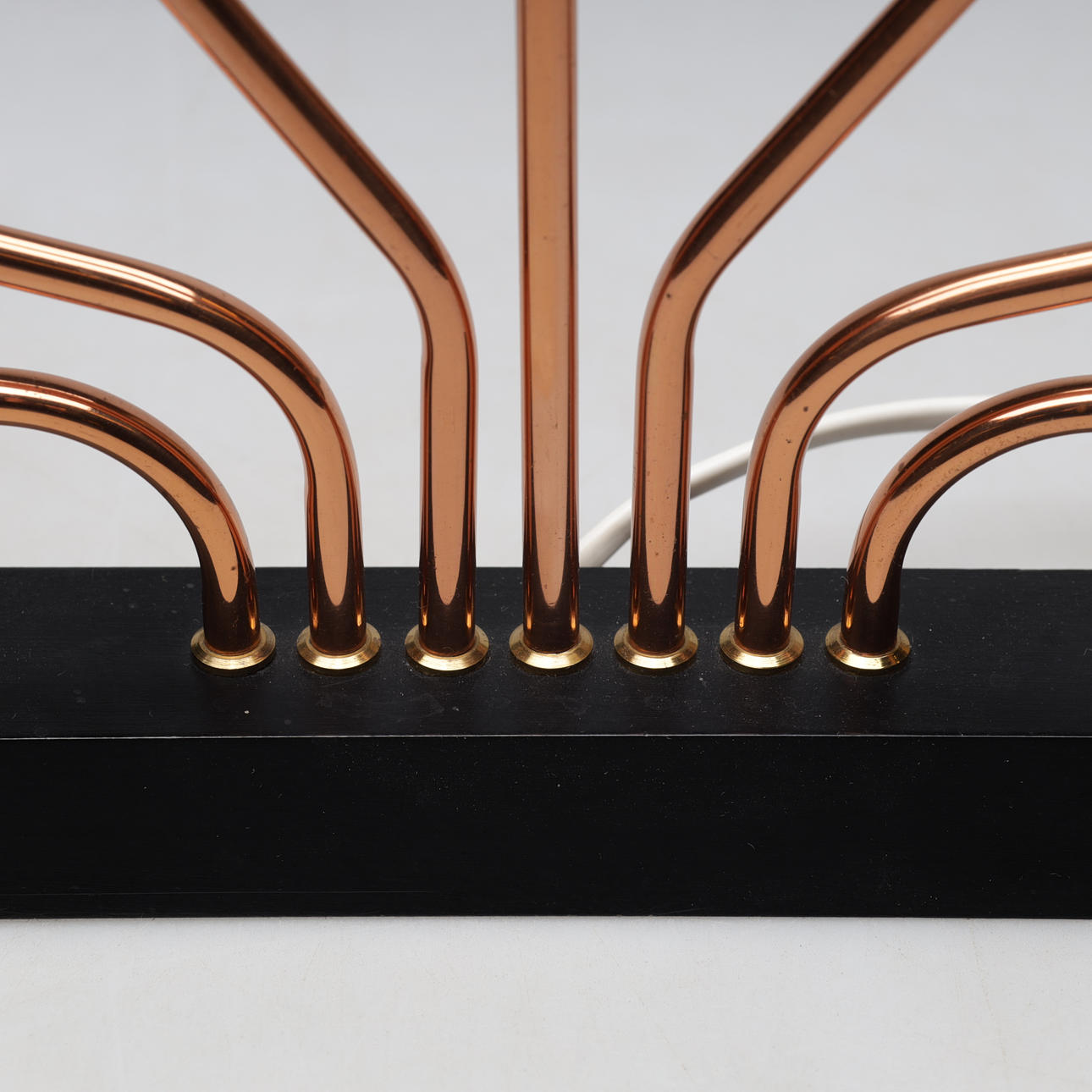 Siete brazos. Peana de madera. Marco de cobre. Longitud unos 50 cm.