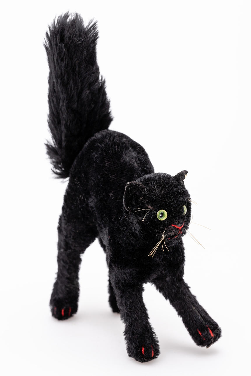 gato, botón en la oreja sin etiqueta de tela, felpa mohair, tamaño aprox.: 25 cm.
