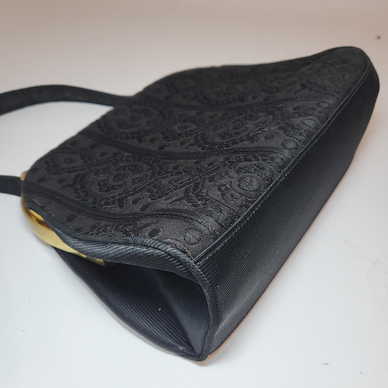 de una asa con cierre dorado y detalle de rosetón. En loneta negra formando cenefas.