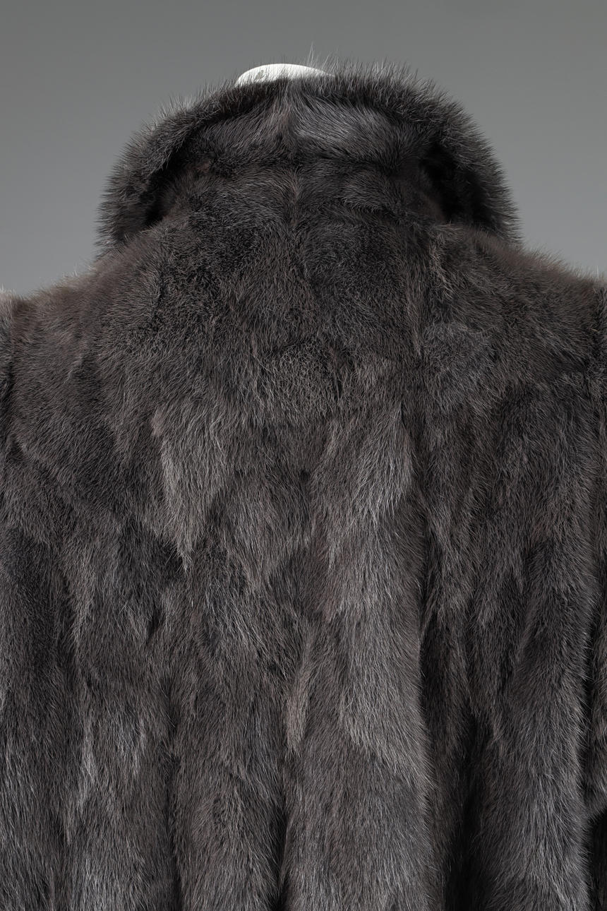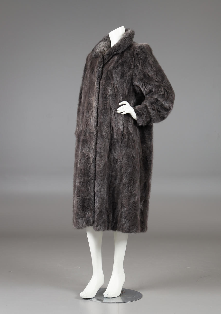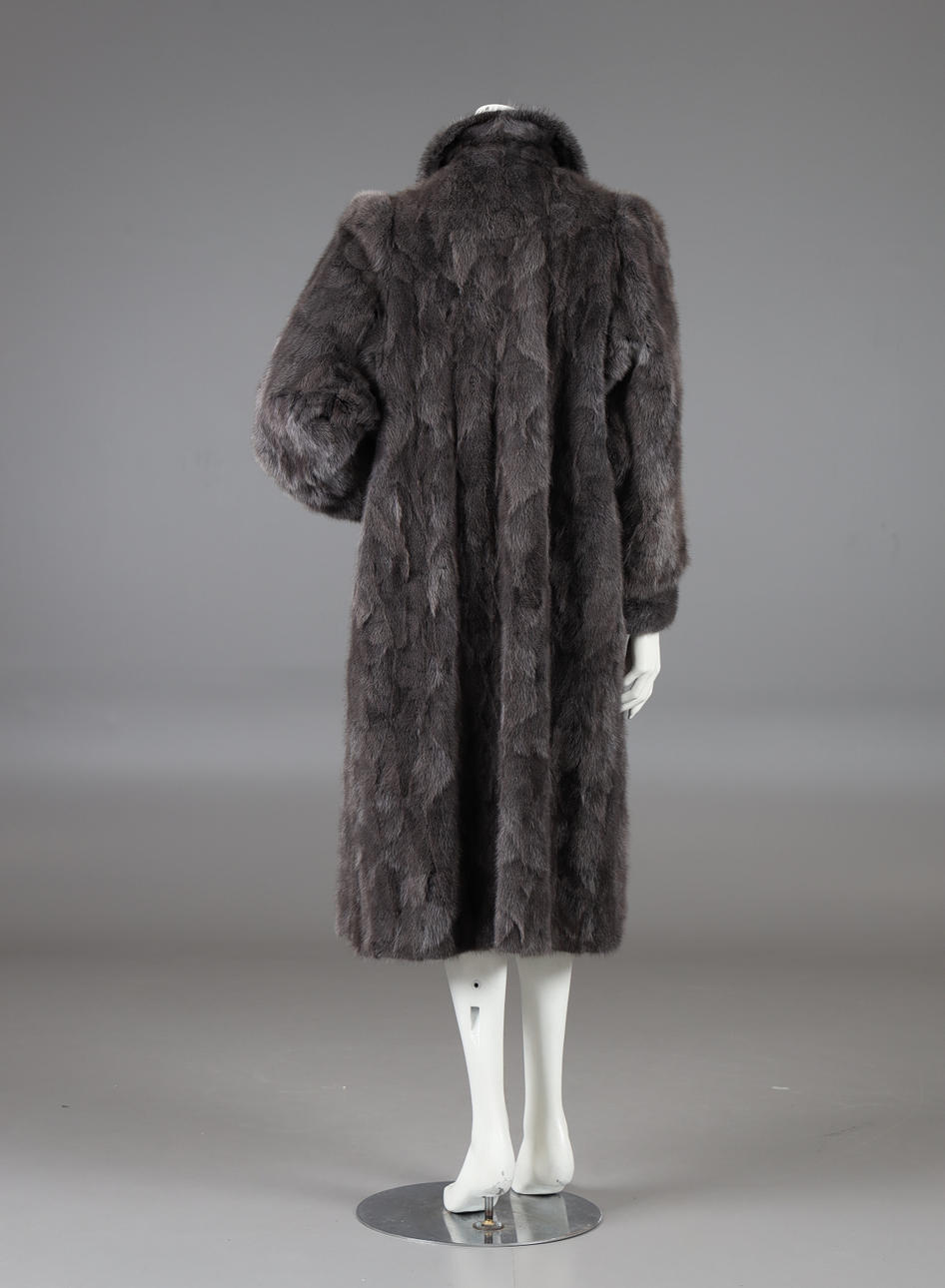 Abrigo de visón gris plateado, talla 40/42 aprox., abotonado delante con bolsillos, largo de espalda aprox. 110 cm, ancho del busto aprox. 115 cm.