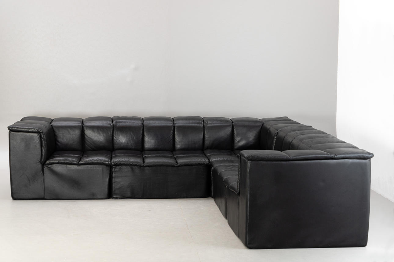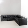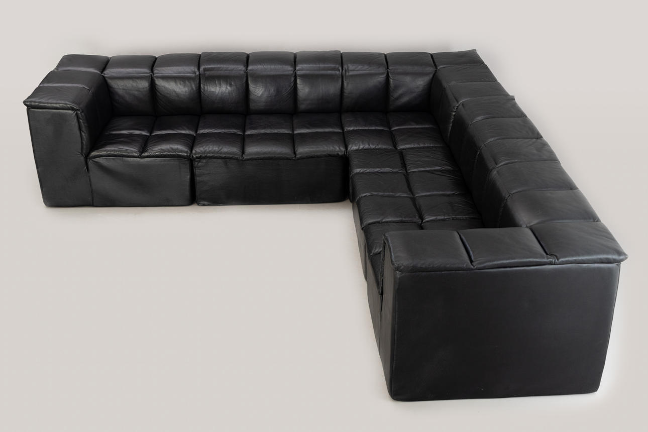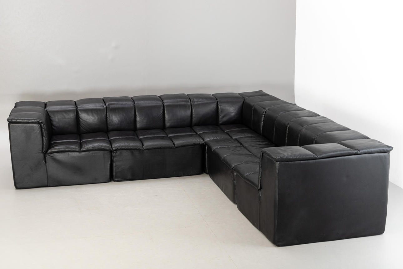 Foam Lübke, sofá modular / sofá, modelo 'Q-System', Alemania. 5 elementos, revestidos de cuero negro. Consta de 3 elementos de esquina y 2 sillones.