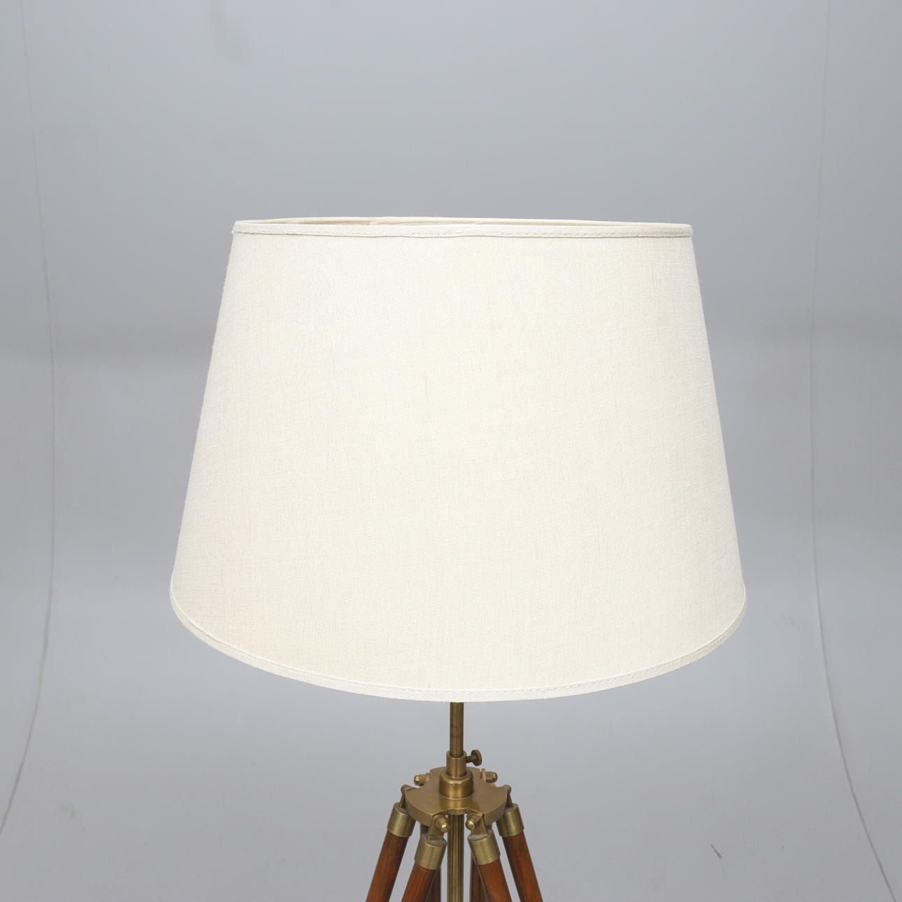 Modelo en forma de caballete. Madera maciza teñida con detalles en latón. Una fuente de luz ajustable. Pantalla textil. Diámetro aproximado 50, altura 160 cm.
