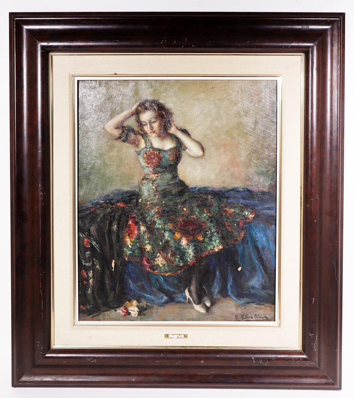 RAMON RIBAS RIUS. DAMA SENTADA. ÓLEO SOBRE LIENZO.
